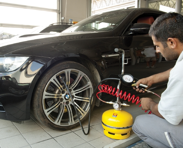 Przenośny inflator do pompowania kół samochodowych ze zbiornikiem o pojemności 12 litrów.