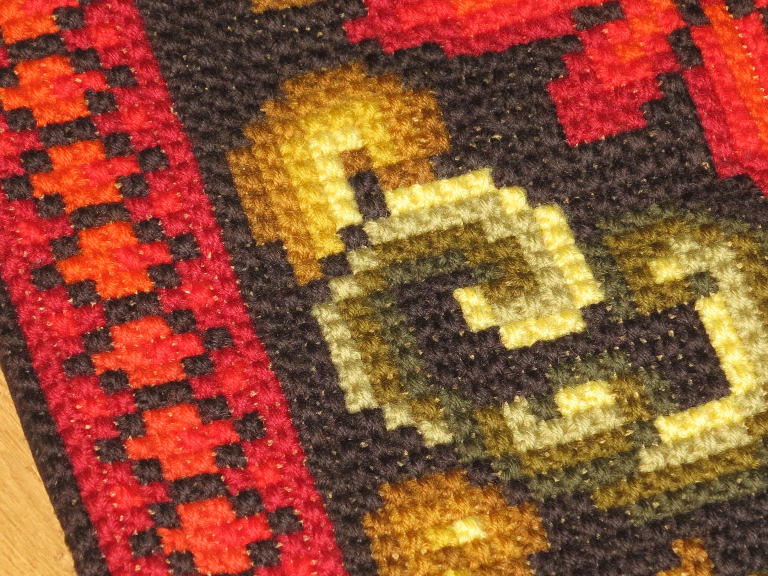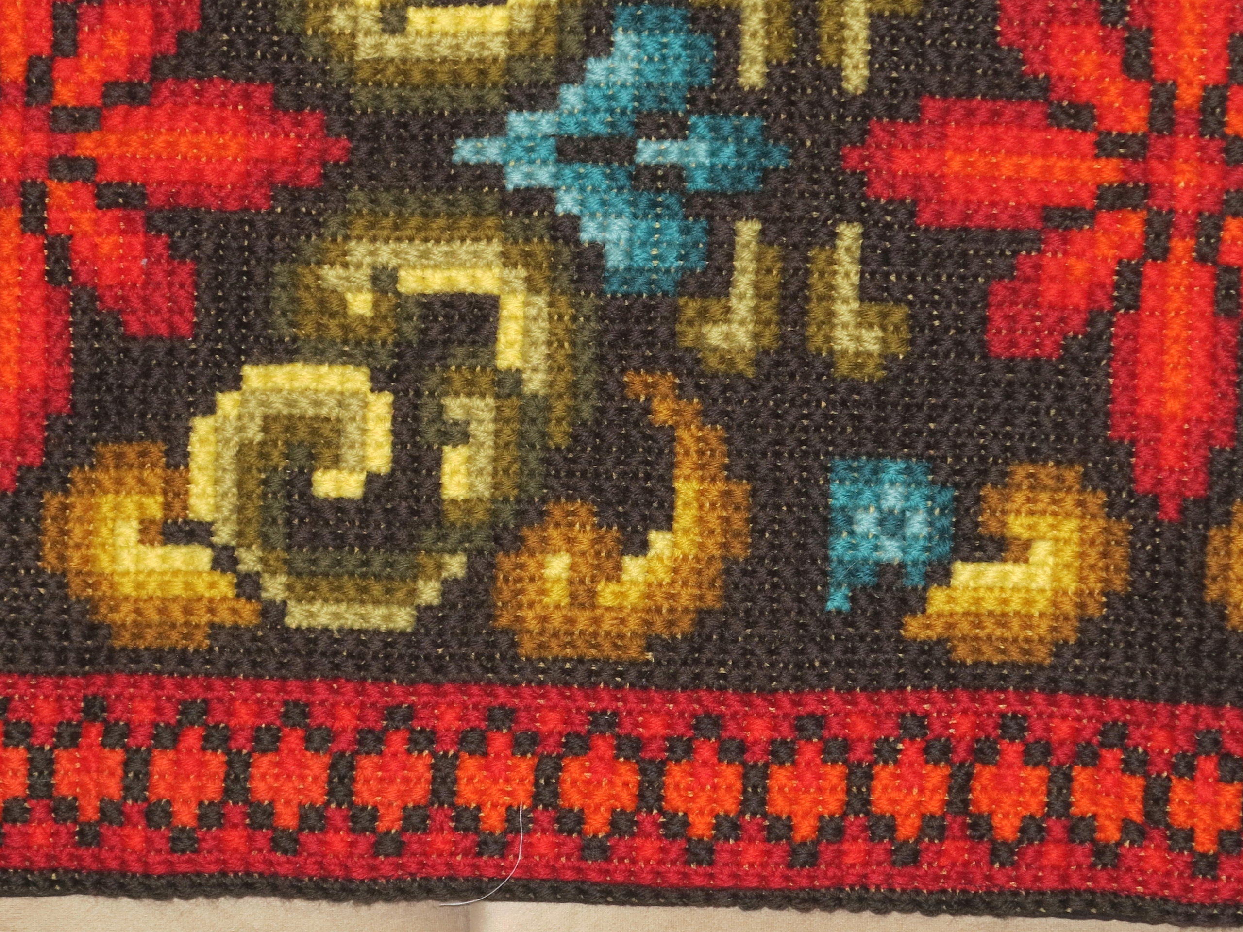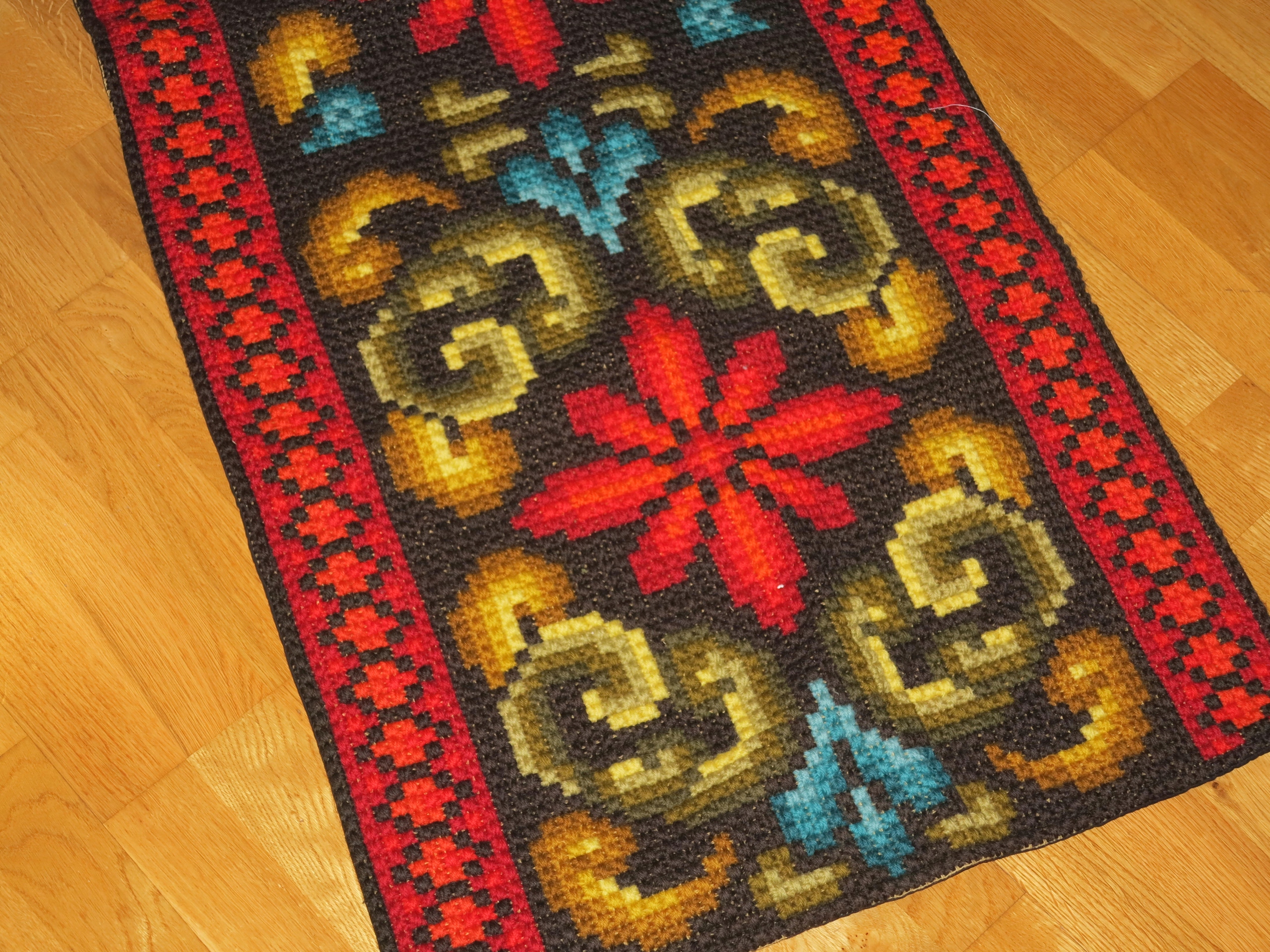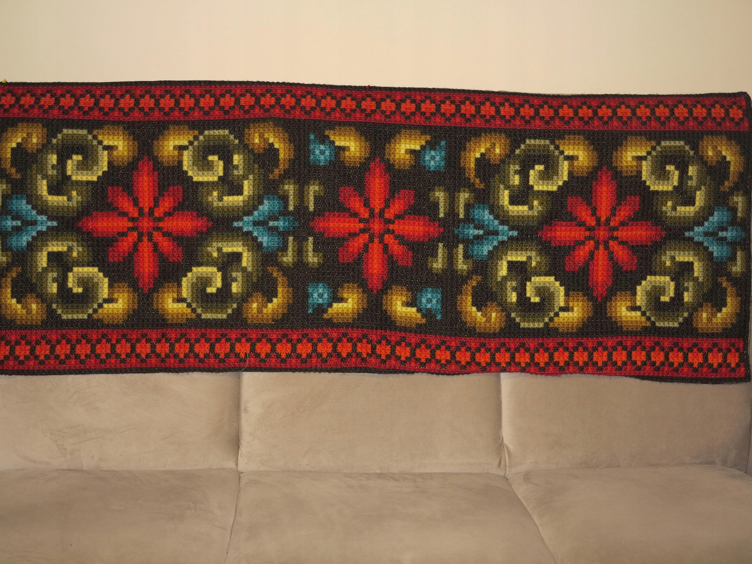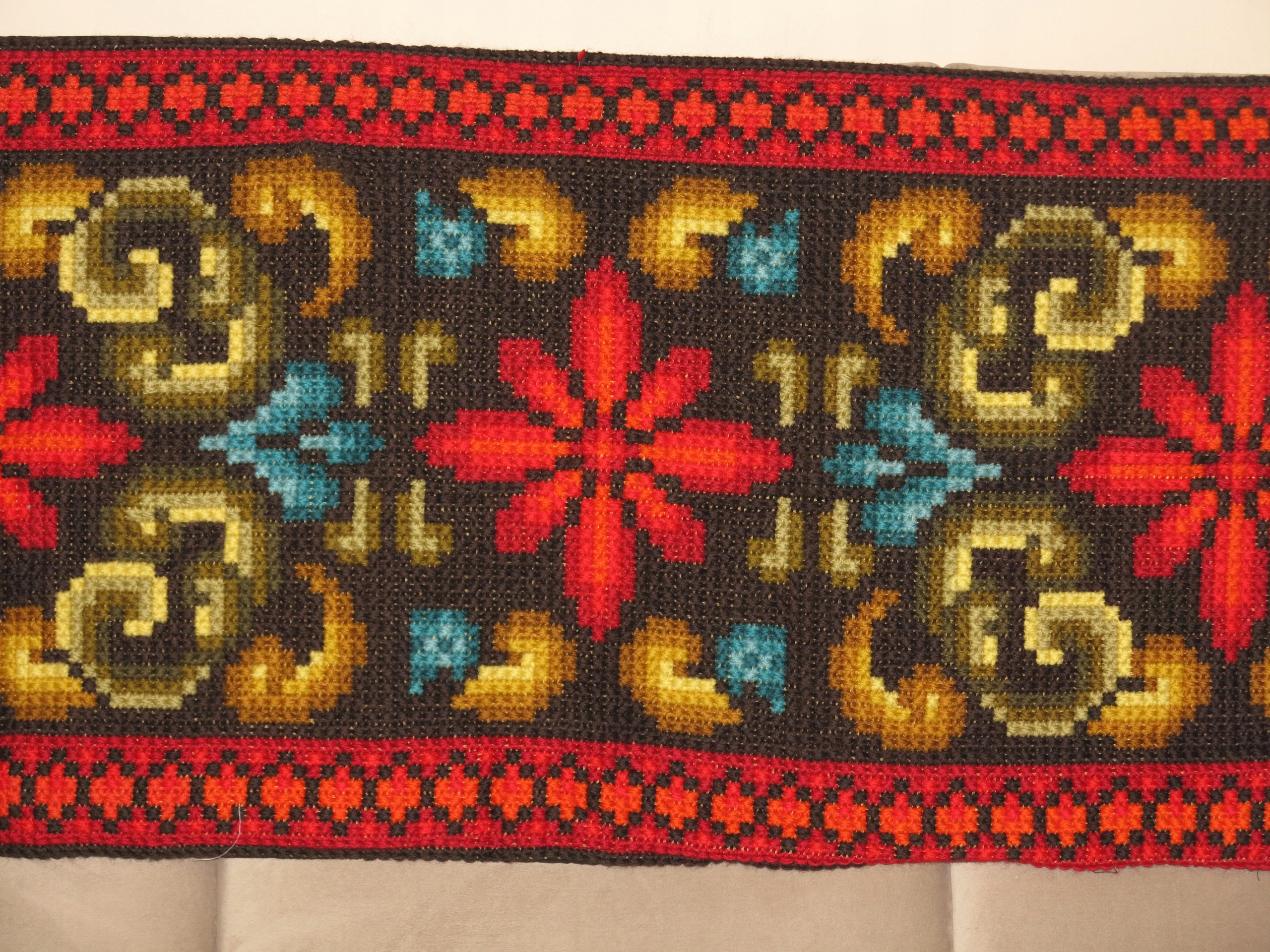 OKAZ- RĘKODZIEŁO- PIĘKNY, WIEKOWY, CZYSTO WEŁNIANY DUŻY KILIM ŚCIENNY LUB SZEROKI LAUFER NA KOMODĘ, Z RĘCZNIE WYKONANYM GRUBYM HAFTEM. OD SPODU NA BAWEŁNIANYM PŁÓTNIE. KOLORY BARDZO WYRAZISTE