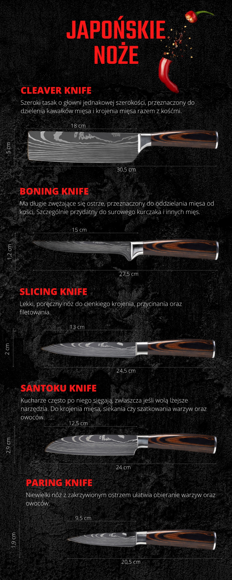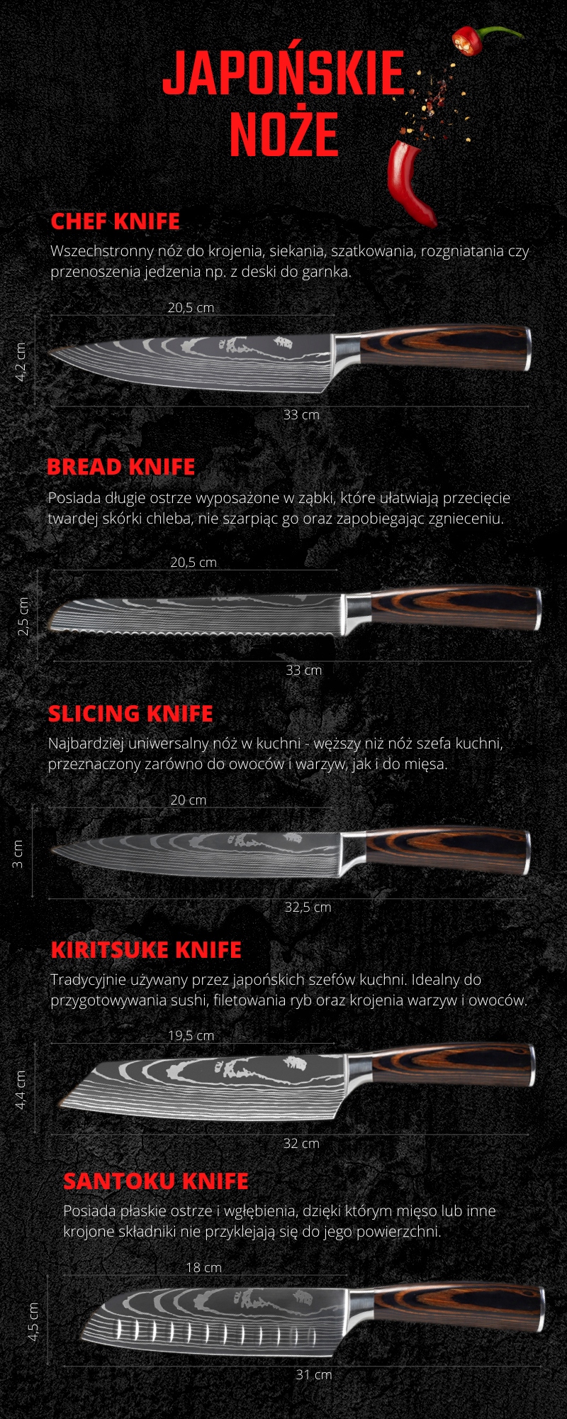 ✅ Świetnie leżą w dłoni - specjalnie zaprojektowana nasada ułatwia docisk noży japońskich do potrawy. Efekt krojenia jest ten sam przy użyciu niewielkiej ilości siły. Doskonale wyprofilowana rękojeść zapewnia ergonomię i wygode w użytkowaniu. Przeznaczone zarówno dla początkujących, jak i wytrawnych szefów kuchni.