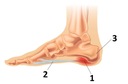 Nagły wyprost stopy podczas stania doprowadza do silnego rozciągnięcia napiętego mięśnia i powięzi (2), co powoduje pojawienie się bólu w okolicy pięty (3).