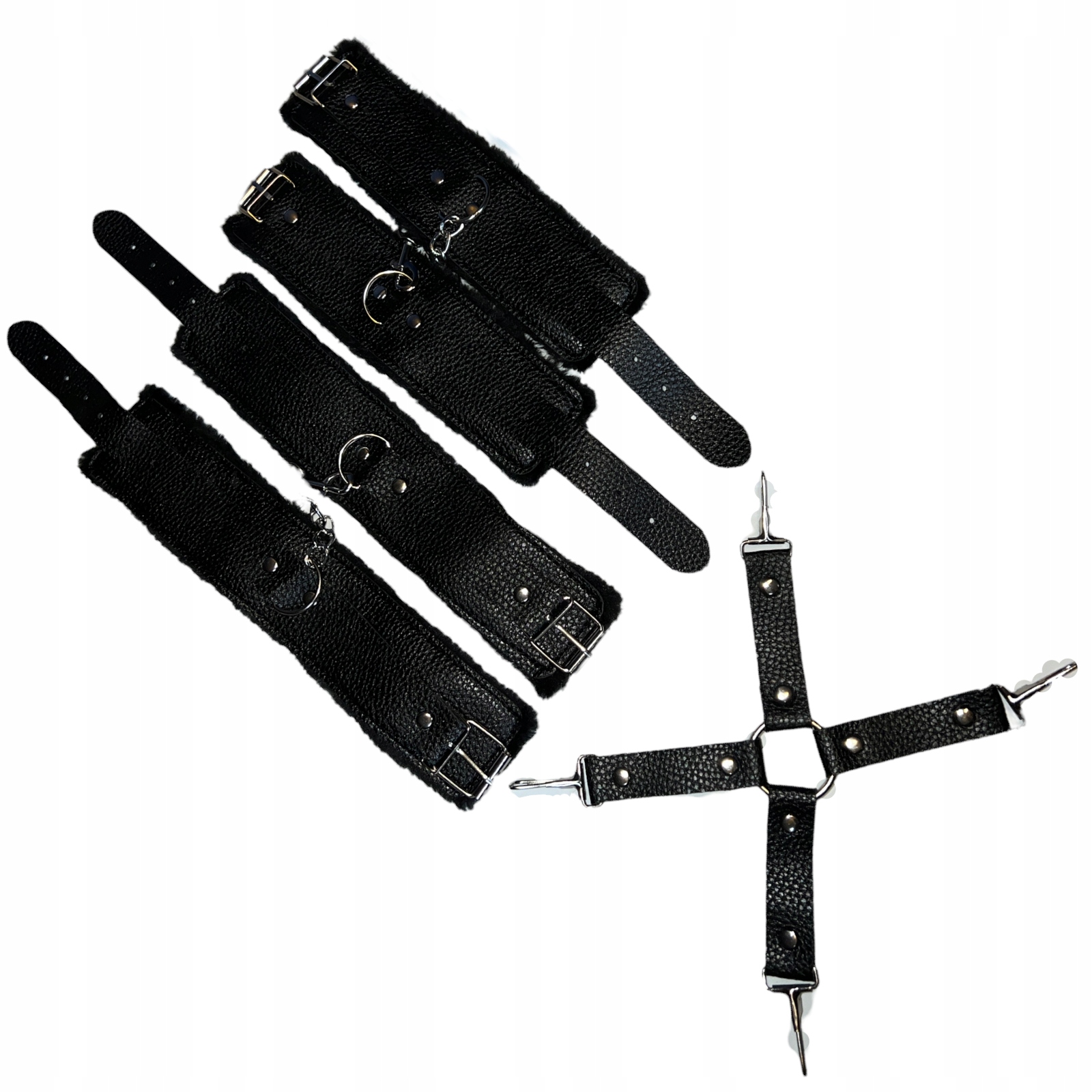 Odkryj nowe horyzonty rozkoszy seksualnej za pomocą tego zestawu do krępowania. Składający się z dwóch par kajdanek na ręce i nogi oraz pasów łączących je w całość, pozwoli Wam uwiązać partnera w najbardziej wymyślnych pozycjach. Ten elegancki komplet wykonany jest z wysokiej jakości skóry ekologicznej i wyposażony jest w miłe futerko wewnątrz. Dzięki niemu będziecie mogli z powodzeniem przetestować najbardziej ekscytujące pozycje Kamasutry.