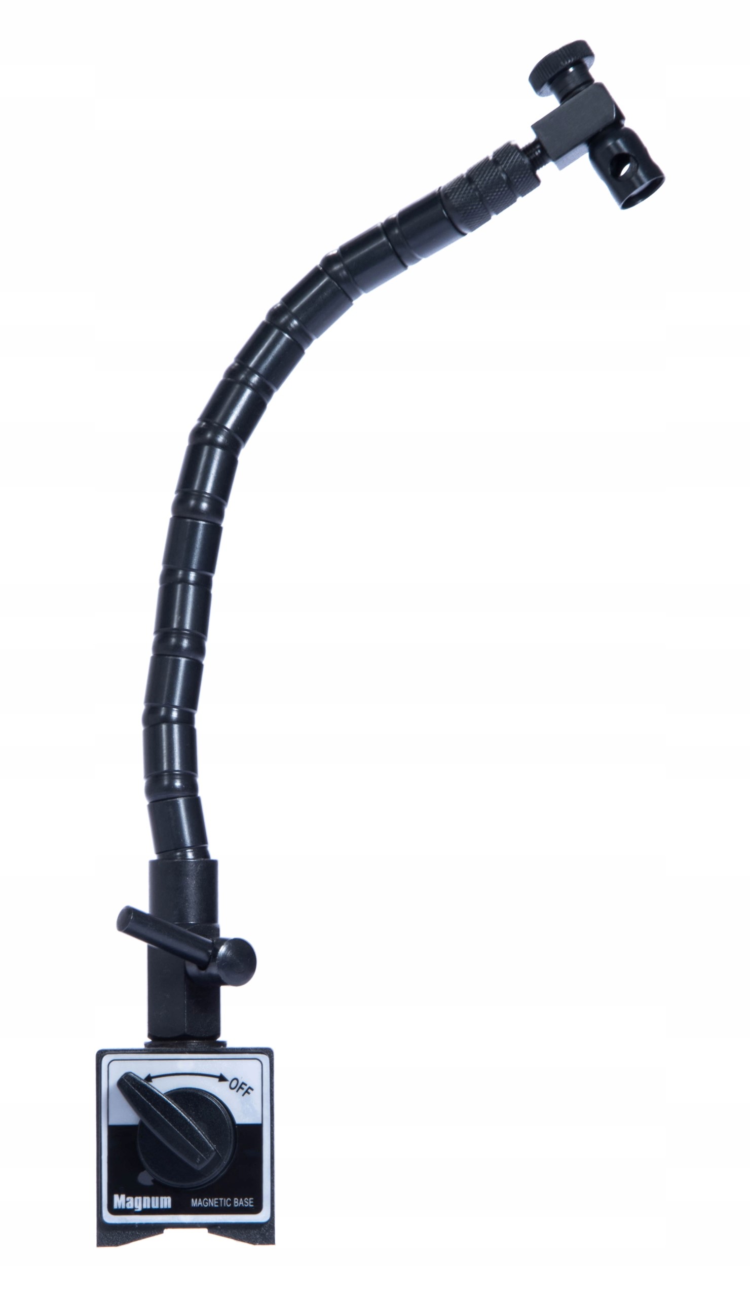Statyw magnetyczny do czujnika zegarowego firmy MAGNUM. Ramię giętkie, ustalane w dowolnym położeniu za pomocą dźwigni. Duży zasięg ramienia i mocny magnes włączany za pomocą przełącznika. Precyzyjne, solidne i estetyczne wykonanie.
