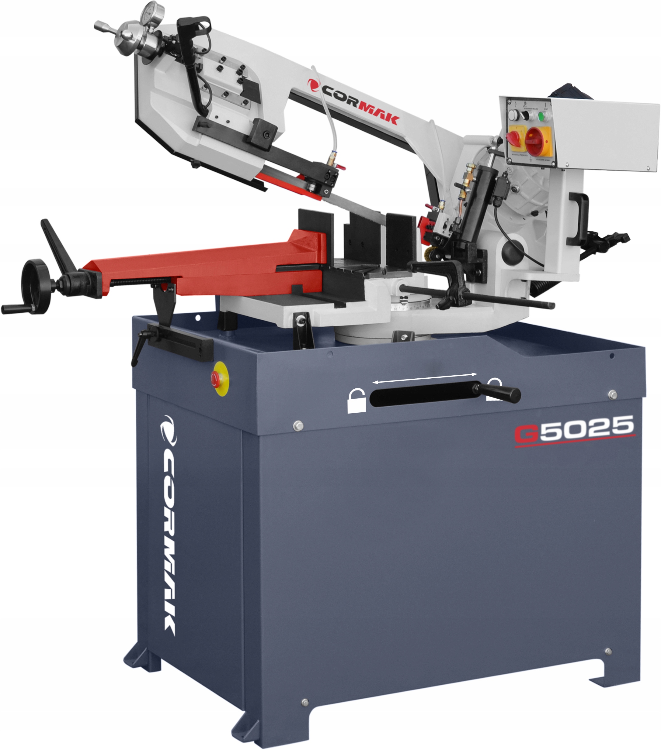Przecinarka taśmowa CORMAK G5025 dzięki wyposażeniu w siłownik hydrauliczny, chłodzenie oraz ramię skrętne od L 45° do P 60°, w połączeniu z brzeszczotami renomowanej niemieckiej firmy Rontgen, znajduje powszechne zastosowanie tam gdzie liczy się precyzja, jakość oraz szybkość cięcia.