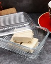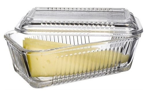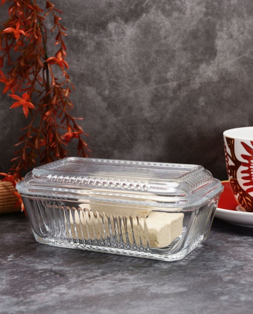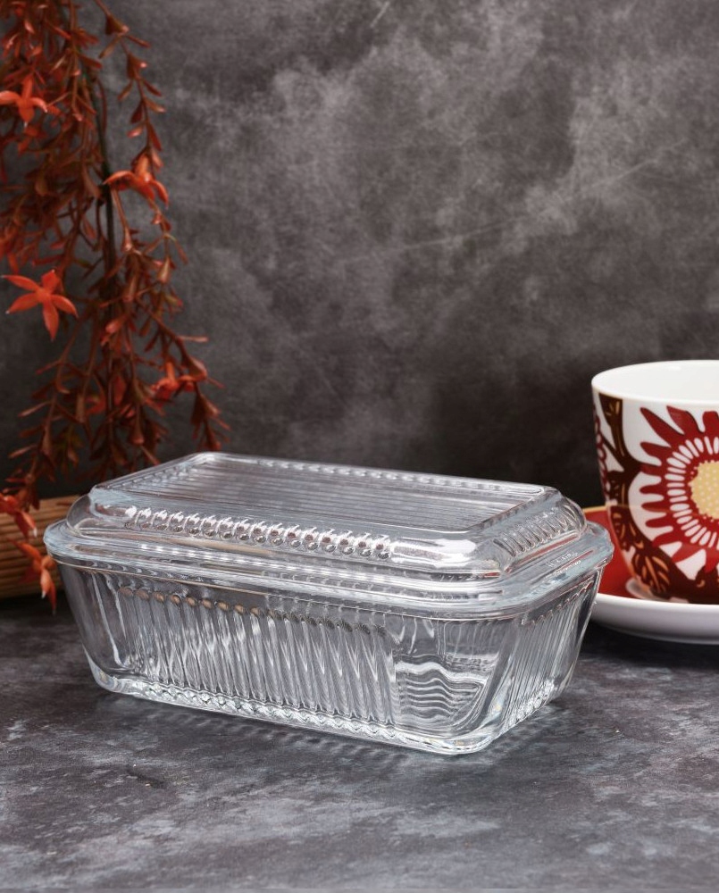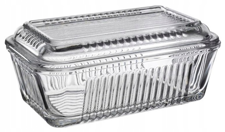 Prosty pojemnik na masło w ozdobnym opakowaniu, wykonany ze szkła. .