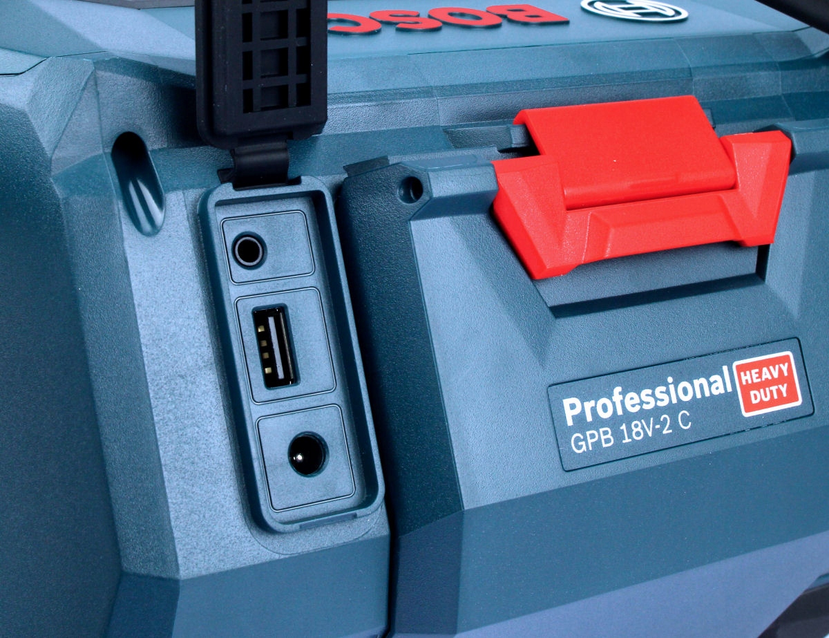 GPB 18V-2 SC Professional firmy BOSCH to budowlane radio stereofoniczne z cyfrowym tunerem FM z dualnym systemem zasilania (sieciowym i akumulatorowym) oraz z gniazdem AUX-IN typu Jack 3,5mm do podłączenia zewnętrznego źródła muzyki, np. odtwarzacza plików MP3, czy telefonu.