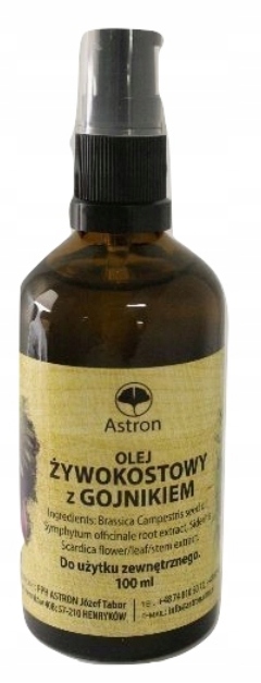 ASTRON Olej Żywokostowy Z Gojnikiem to olej do użytku zewnętrznego. Olej żywokostowy może być stosowany przy problemach z tkanką kostną , a także przy wsparciu leczenia chorób kręgosłupa, stawu biodrowego, kolan, bóle reumatyczne, oraz rwy kulszowej. Może służyć również jako kosmetyk.
