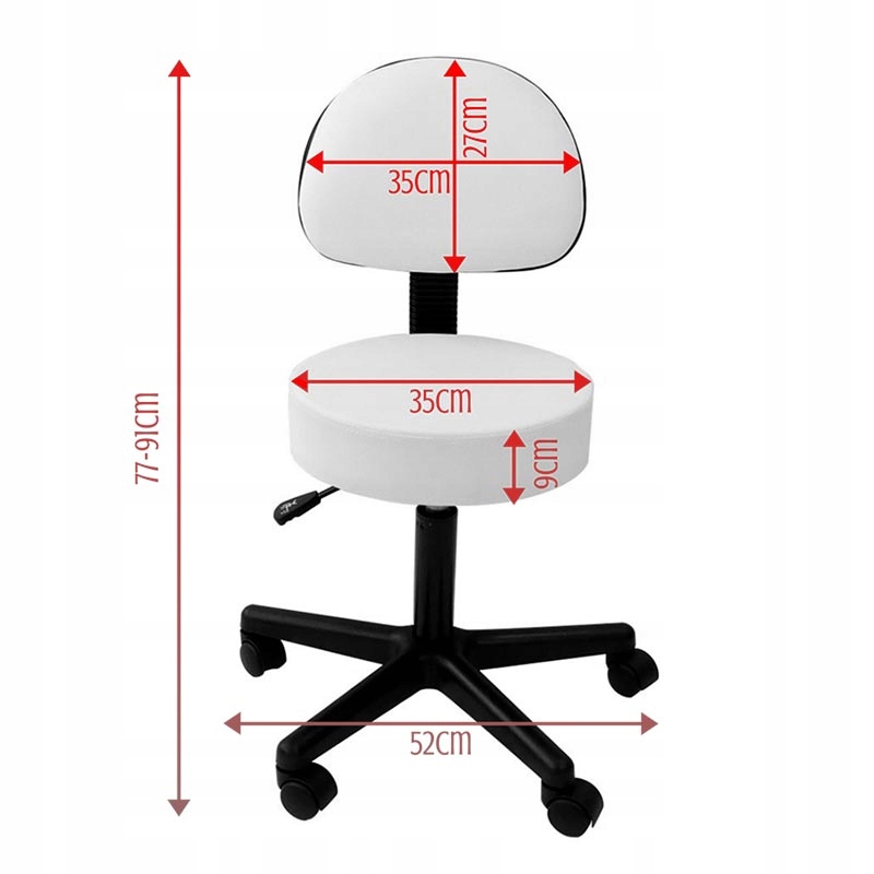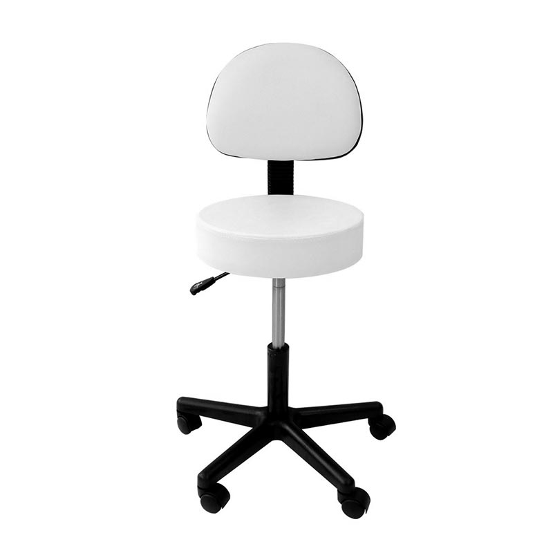 Taboret kosmetyczny o klasycznym, uniwersalnym wyglądzie, który wpasuje się w design każdego gabinetu kosmetycznego. Posiada okrągłe siedzisko wypełnione grubą pianką oraz oparcie. Całość pokryta eko-skórą łatwą w utrzymaniu czystości, w kolorze białym. Taboret umieszczony na pięcioramiennej podstawie z kółkami.