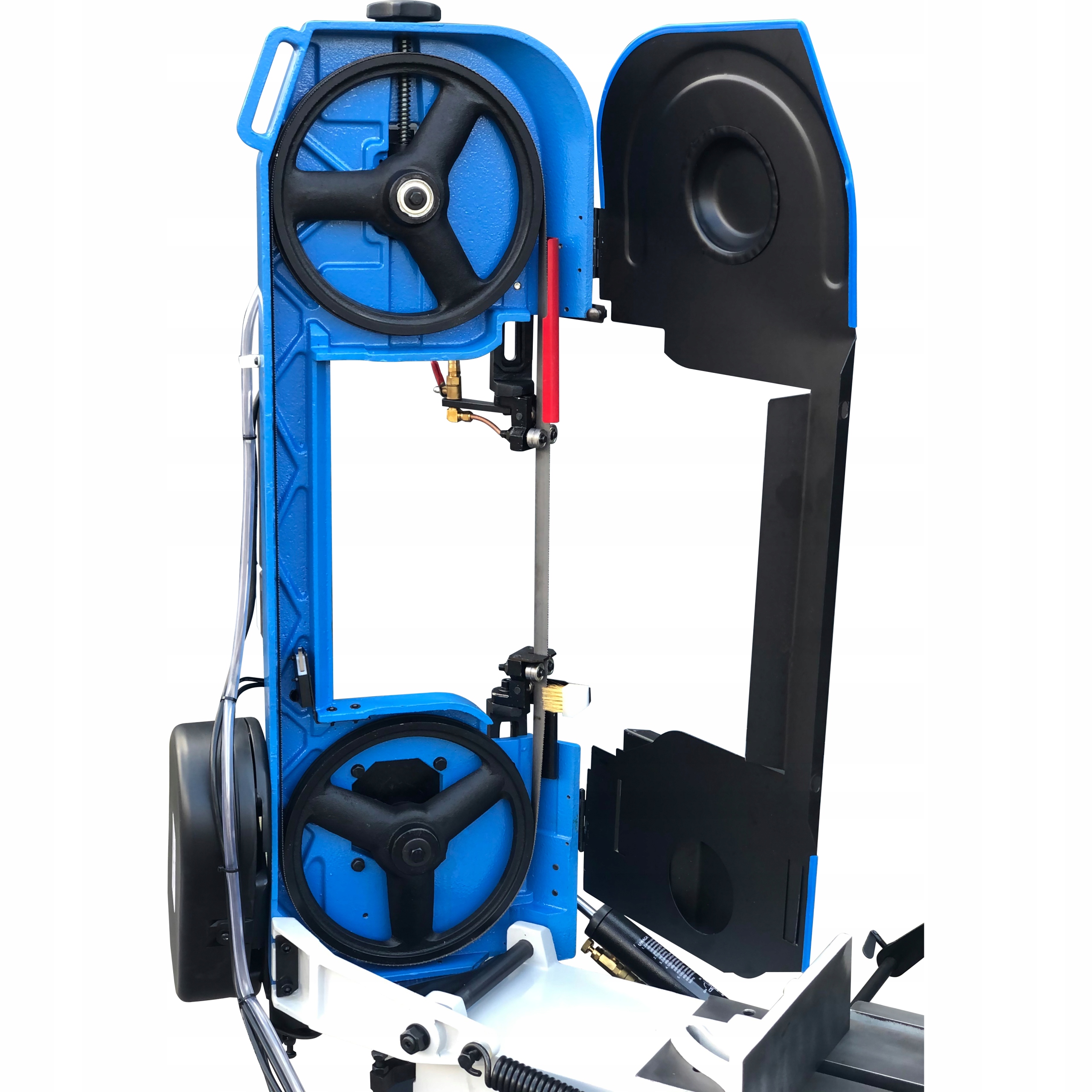 ✅ Bezpieczeństwo podczas procesu cięcia zapewnia instalacja elektryczna spełniające wszelkie wymogi CE. Maszyna posiada wyłącznik krańcowy zatrzymujący maszynę po skończeniu procesu cięcia, wyłącznik awaryjny tzw. ”grzybek bezpieczeństwa”, szereg mikro-wyłączników wyłączających maszynę gdy np.: otworzymy osłonę przekładni pasowej lub osłonę taśmy tnącej.