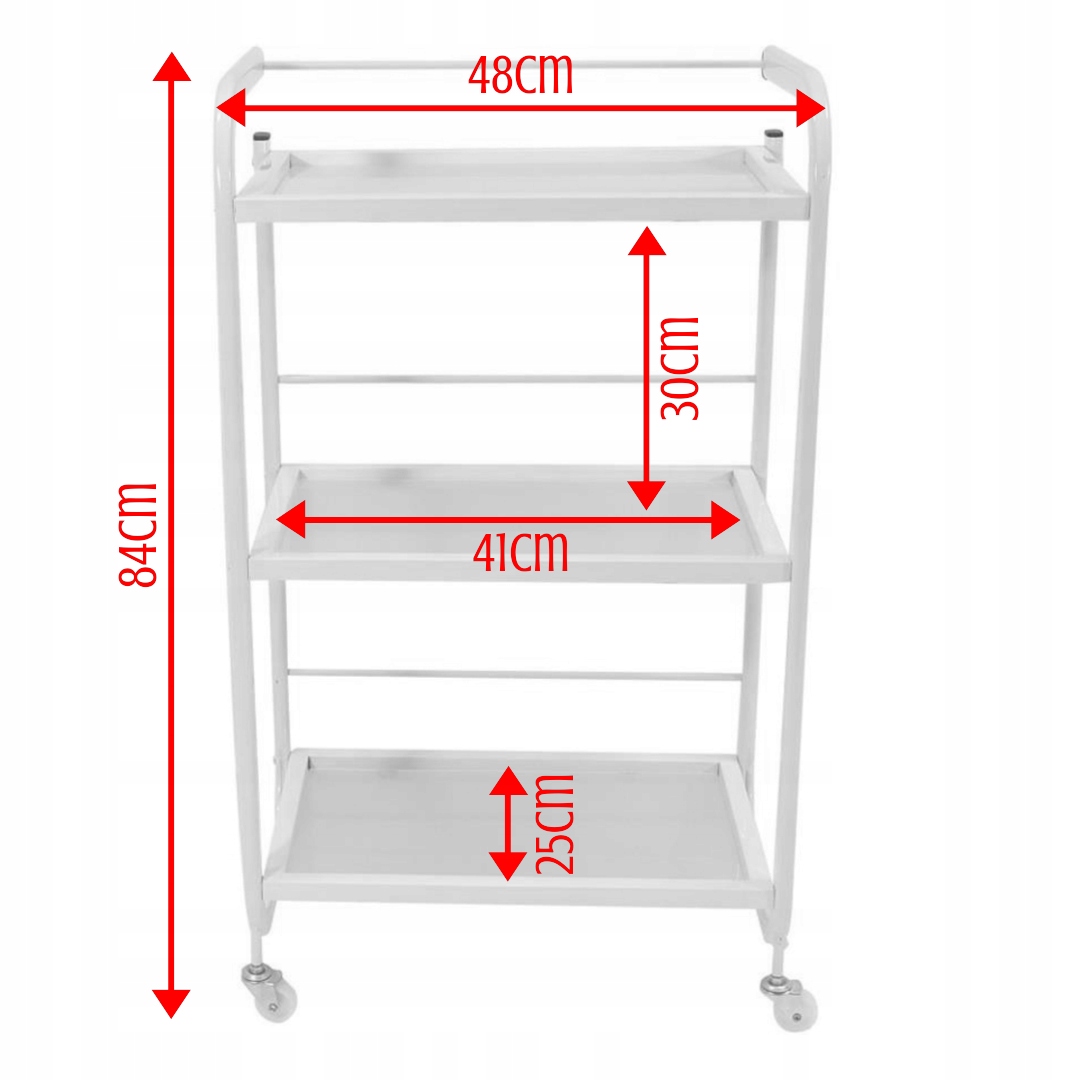 Stolik posiada metalowy stelaż z praktycznym uchwytem do manewrowania oraz komplet obrotowych kółek jezdnych. Zaprojektowany został z myślą o ergonomii. Jego wysokość i struktura zostały starannie przemyślane, aby wygodnie pomieścić różne produkty. Dla branży beauty oznacza to wygodę, że blat znajduje się na odpowiednim poziomie dla osób korzystający w pozycji siedzącej lub stojącej ze stolika. Umożliwiając im łatwa i precyzyjną pracę.