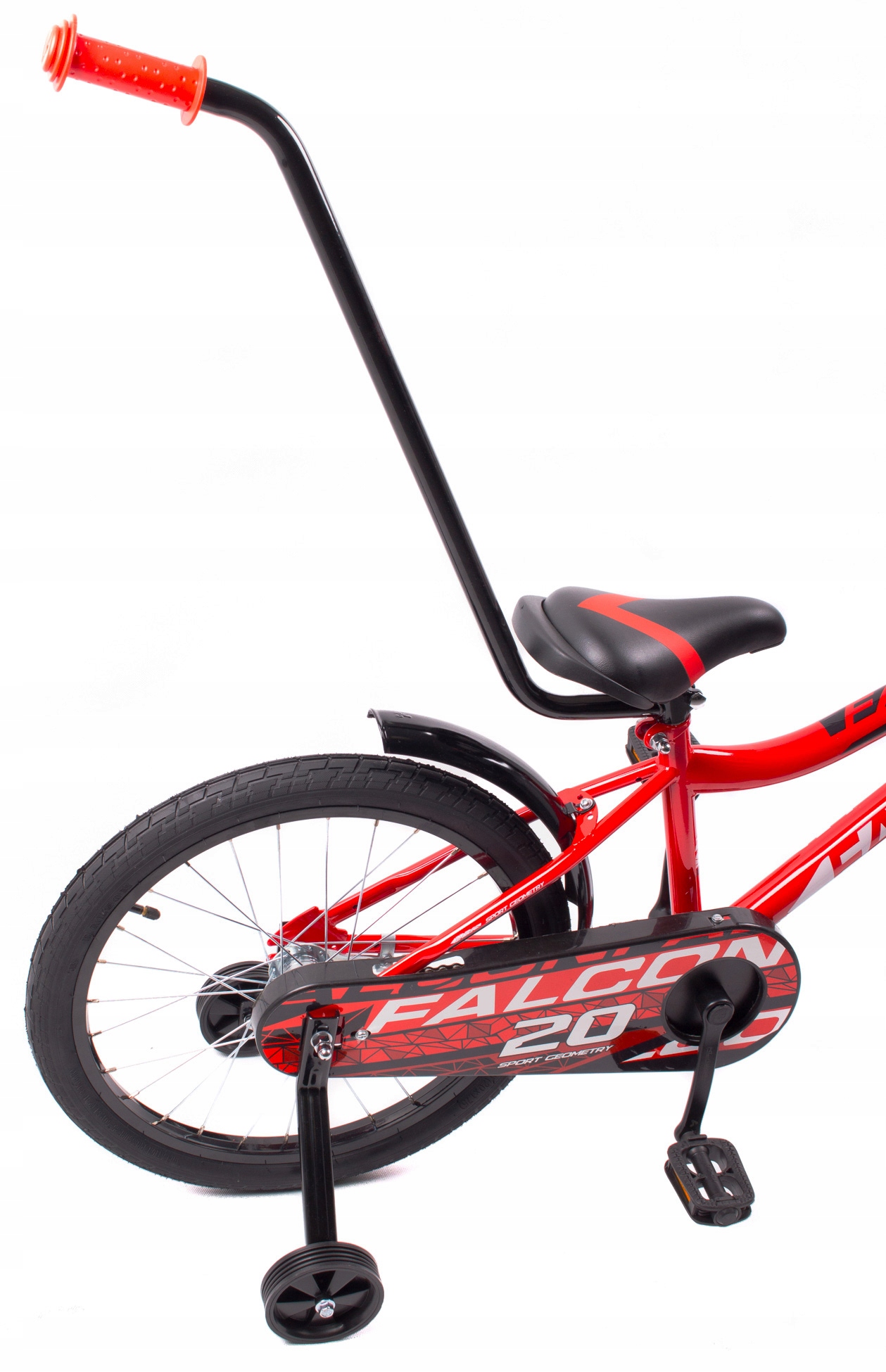 Rower dziecięcy Falcon to doskonały model z którym początki przygody z jazdą na rowerze będą gwarancją doskonałej zabawy, bezpieczeństwa i komfortu. Zaprojektowany został w taki sposób aby trafić w upodobania każdego młodego użytkownika. Posiada stalową ramę i widelec, aluminiowe obręcze, miękkie siodełko oraz kierownicę z możliwością regulacji wysokości. Koła 20’’ osłaniane są przez błotniki, łańcuch został zabezpieczony specjalną osłoną, a na kierownicy zamontowany jest niewielki dzwonek i gumowe, antypoślizgowe chwyty. Dodatkowo rower posiada kółka boczne zapewniające stabilne podparcie, dzięki temu dziecko może czuć się bardzo pewnie i skupić całą swoją uwagę na nauce trzymania równowagi i prawidłowego balansu. Kółka posiadają możliwość regulacji, a także całkowitego demontażu kiedy młody rowerzysta opanuje już odpowiednie umiejętności. Rower posiada napęd 1-biegowy (bez przerzutek) oraz hamulce przednie typu V-break i tylne Torpedo. Jest to bardzo wygodne i praktyczne rozwiązanie, a przy tym wystarczające aby dziecko było całkowicie bezpieczne.