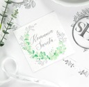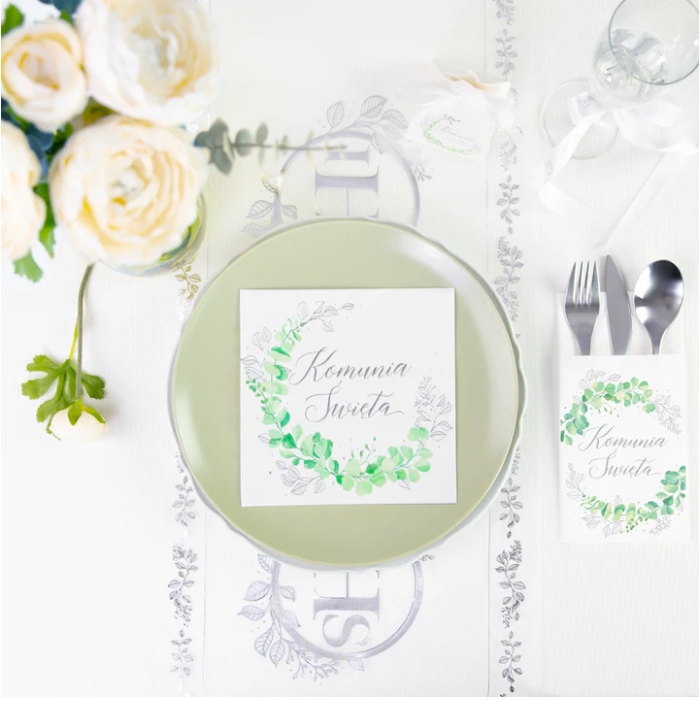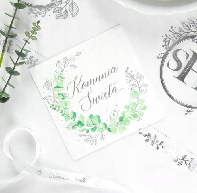 ⭐Serwetki komunijne z pięknym motywem zielonych i srebrnych listków eukaliptusa. Subtelny, srebrny napis Komunia Święta otoczony wieńcem delikatnych listków sprawia, że serwetka jest elegancka i oryginalna.