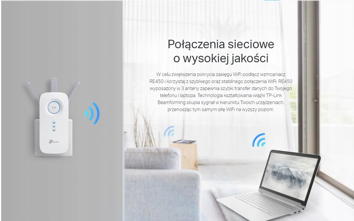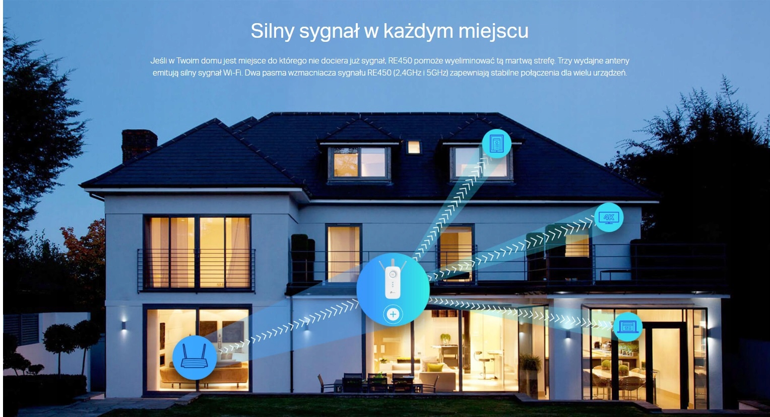 Przy zastosowaniu sieci internetowej o wysokiej przepustowości przesyłanie sygnału drogą bezprzewodową wymaga odpowiedniego urządzenia. Jest nim wzmacniacz TP-LINK RE450, który umożliwia uzyskanie stabilnego i przede wszystkim bardzo szybkiego połączenia z Internetem. Dzięki obsłudze dwóch zakresów częstotliwości w przypadku połączenia pasma 2,4 i 5 GHz użytkownik może uzyskać łączną prędkość na poziomie aż 1300 Mb/s! Sprawia to, że przesyłanie strumieniowe w bardzo wysokiej jakości czy pobieranie plików realizowane jest sprawnie i w niezwykle krótkim czasie.