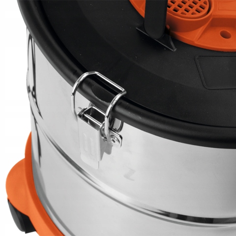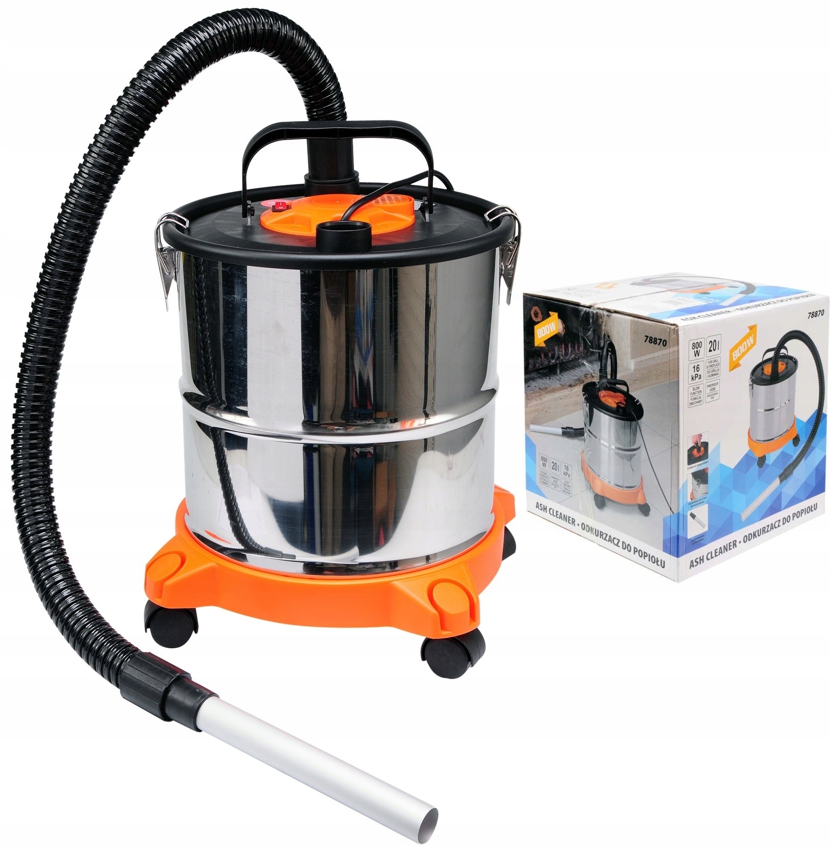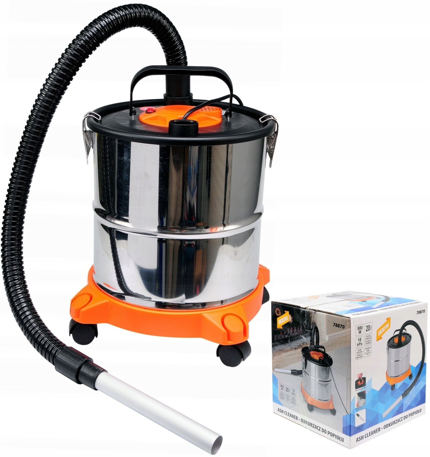 Odkurzacz do popiołu z kominka lub grilla, silnik o mocy 800W (maks. 1000W), podciśnienie: 16kPa. - zbiornik ze stali nierdzewnej o poj. 20L, - podstawa zbiornika na kołach, - wielostopniowy system filtracji: filtr typu Hepa oraz filtr materiałowy, - żaroodporny wąż ssący o długości ok. 1m z aluminiowa końcówką 23 cm, - funkcja dmuchawy, - składany uchwyt do przenoszenia urządzenia, - kabel zasilający ok. 1,8 m.
