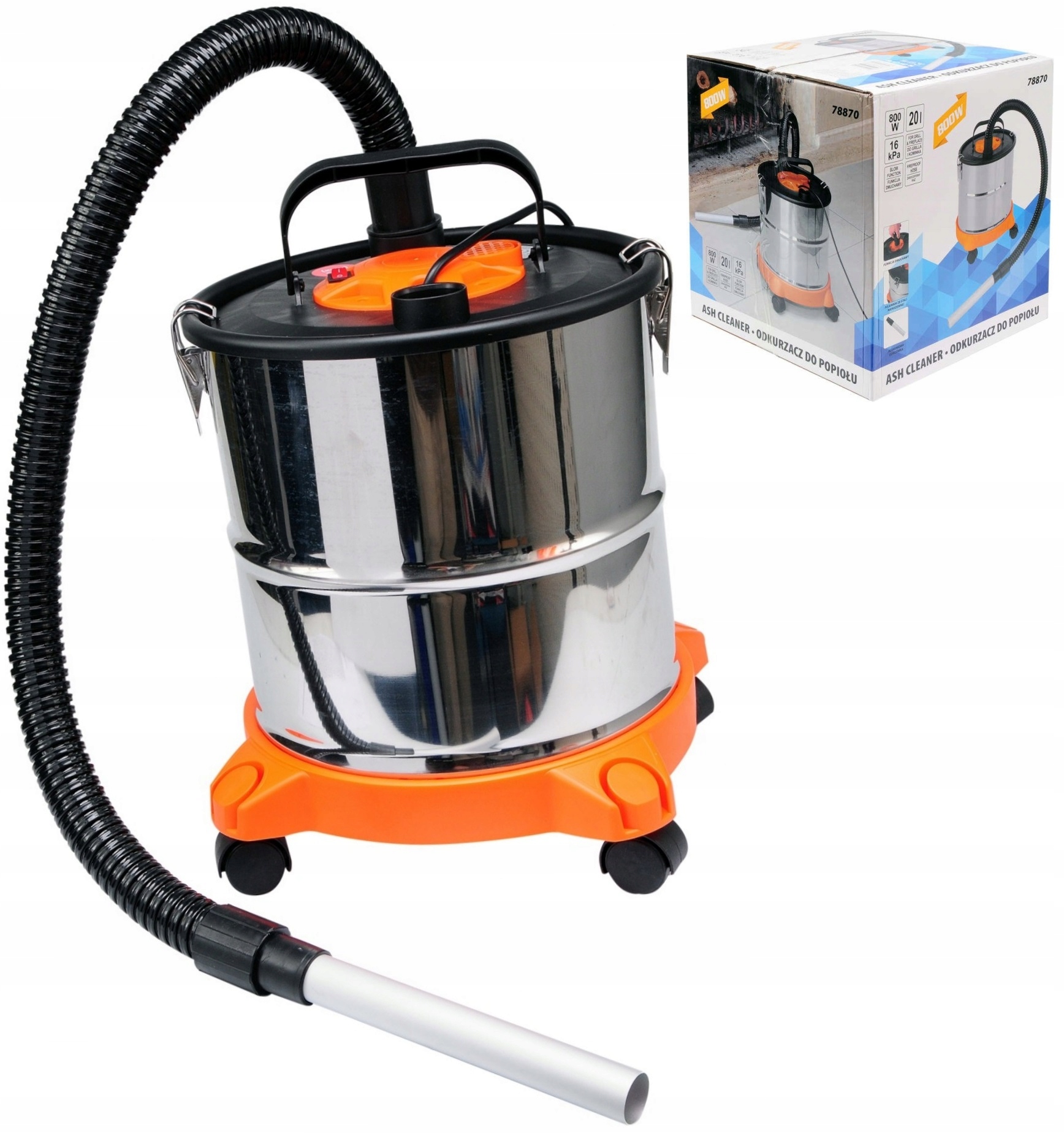 Odkurzacz do popiołu z kominka lub grilla, silnik o mocy 800W (maks. 1000W), podciśnienie: 16kPa. - zbiornik ze stali nierdzewnej o poj. 20L, - podstawa zbiornika na kołach, - wielostopniowy system filtracji: filtr typu Hepa oraz filtr materiałowy, - żaroodporny wąż ssący o długości ok. 1m z aluminiowa końcówką 23 cm, - funkcja dmuchawy, - składany uchwyt do przenoszenia urządzenia, - kabel zasilający ok. 1,8 m.