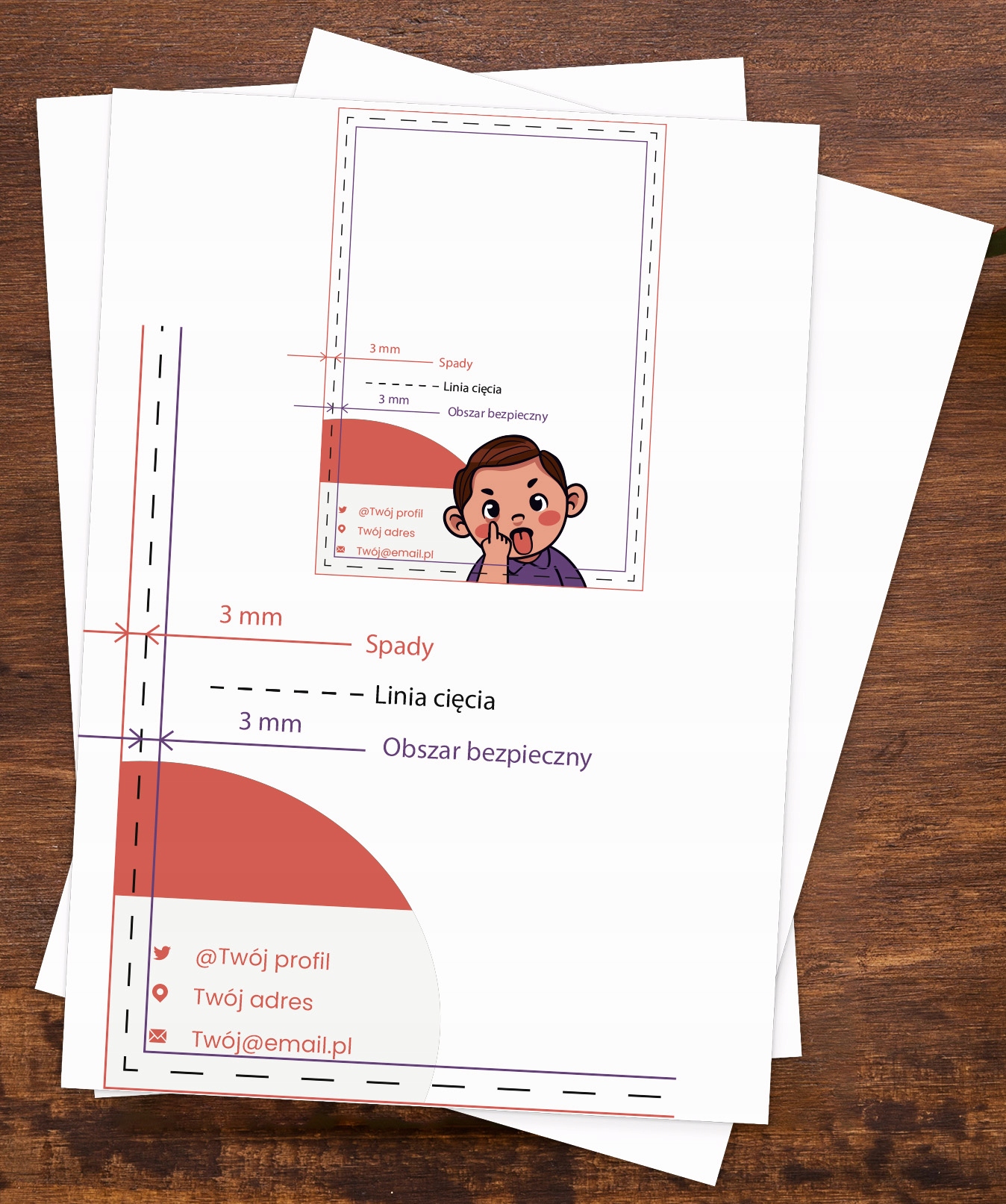✅ BEZPIECZNE POLE ZADRUKU - teksty lub ważne grafiki (np. logotypy) niestanowiące tła umieszczaj w bezpiecznym polu minimum 3mm od krawędzi cięcia.