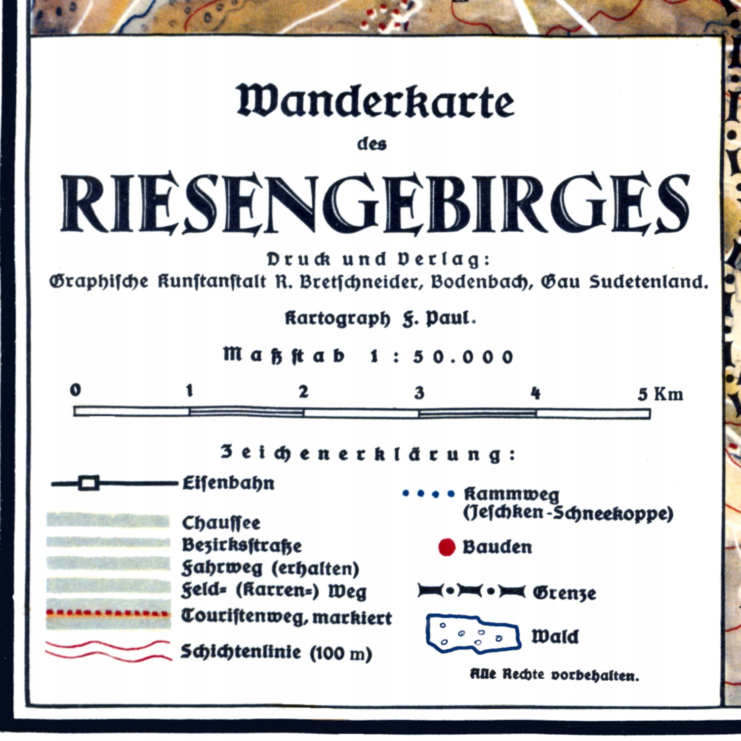 Mapa prezentuje szlaki i obiekty turystyczne Karkonoszy na pograniczu ówczesnych Niemiec i Czech, czynne w latach 30. XX w. Wiele z pokazanych na niej miejsc już nie istnieje. Przez swoje żywe kolory i umiejętnie oddane ukształtowanie terenu wywołuje wrażenie trójwymiaru.