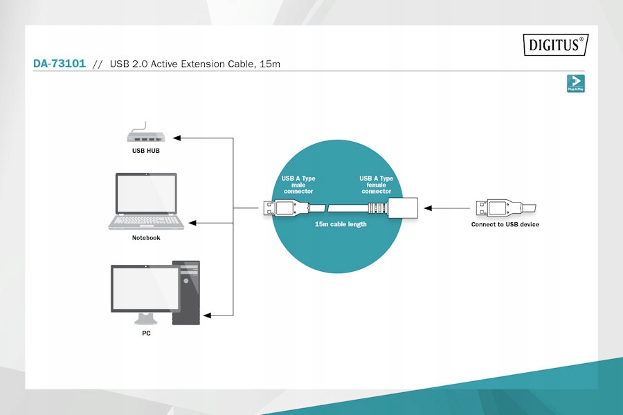 Wydłuża o 15 metrów dystans (poprzez wzmocnienie sygnału), jaki może dzielić urządzenie wyposażone w port USB od komputera / huba USB, do którego ma być ono podłączone..
