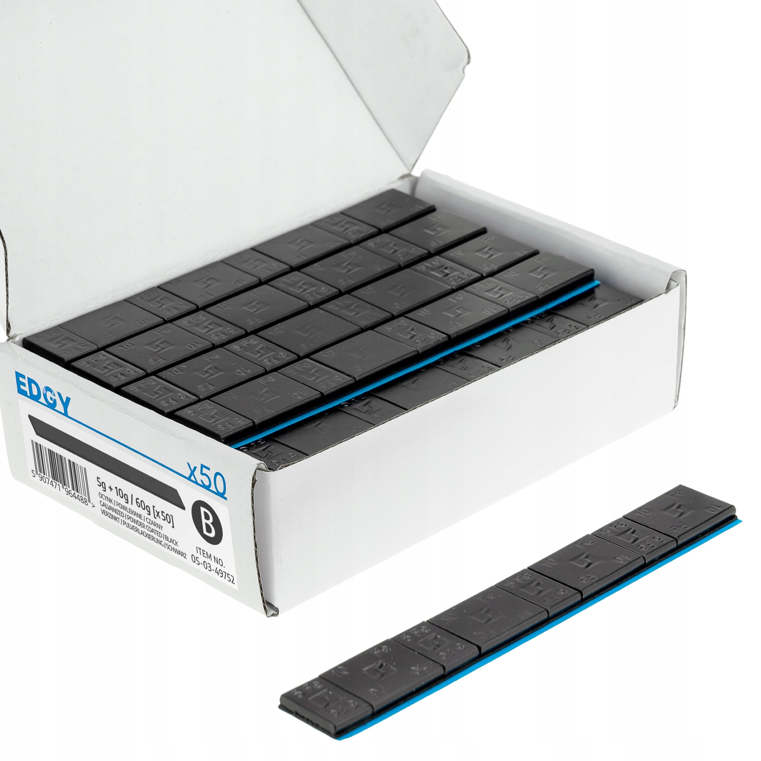 Opakowanie zawiera 50 sztuk pasków, każdy o wadze 60g. Na każdym pasku znajduje się 8 ciężarków korekcyjnych: 4 x 5g oraz 4 x 10g.