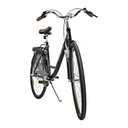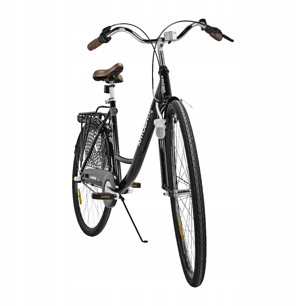 Elegancki rower damski w klasycznym wykonaniu, z aluminiową ramą, trzema biegami, tylnym hamulcem nożnym, przednimi hamulcami typu V oraz oponami miejskimi na dwuwarstwowych felgach aluminiowych. Rower ma poza tym wygodne siodełko oraz rączki i jest wyposażony w praktyczne detale takie jak dzwonek, bagażnik, osłonę łańcucha, błotniki z przodu i z tyłu, nóżkę i odblaski.