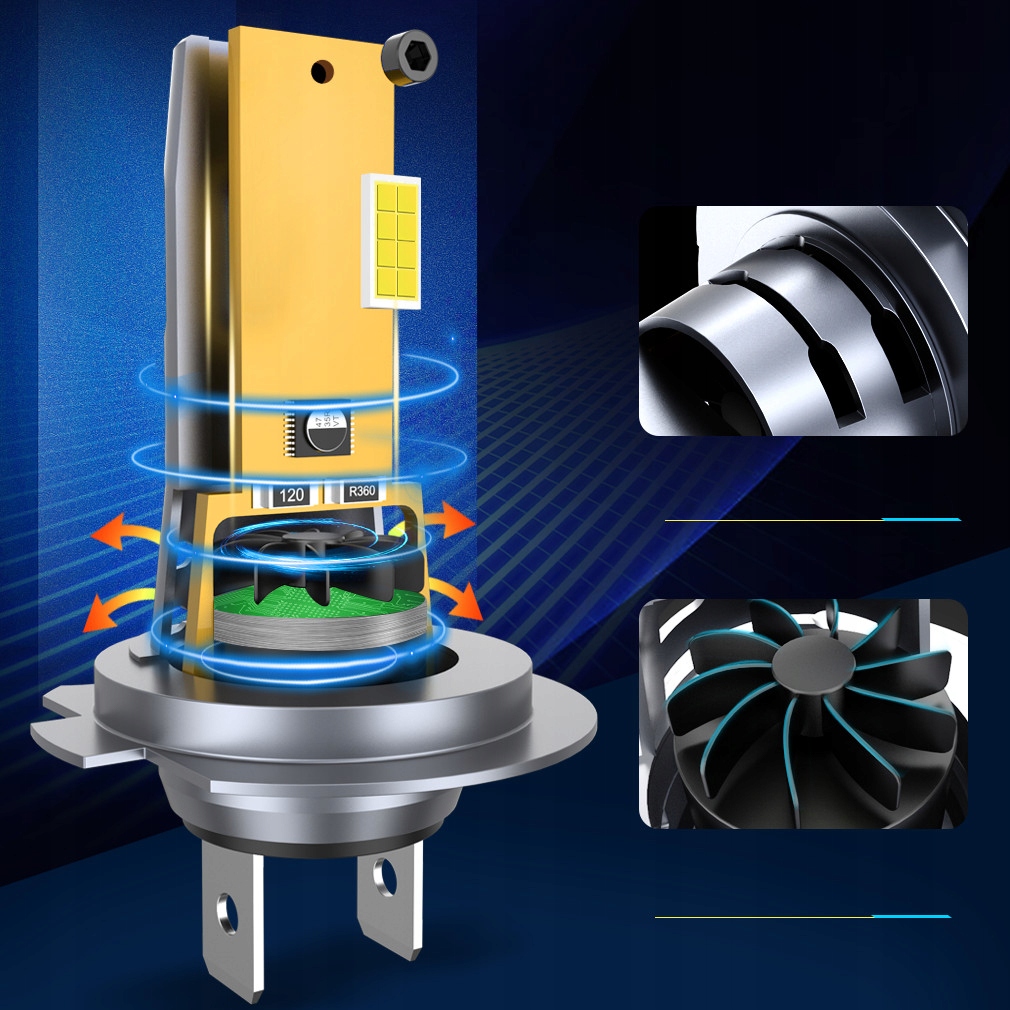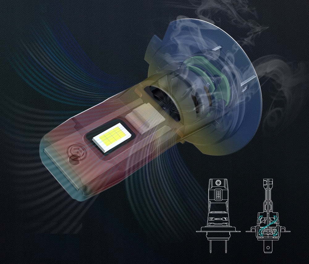 Интеллектуальная двухступенчатая система охлаждения с чипом радиатором, высокая эффективность, отсутствие помех FM / CB радио и отсутствие эффекта выгорания, как в ксеноновые нити и традиционные галогенные лампы.