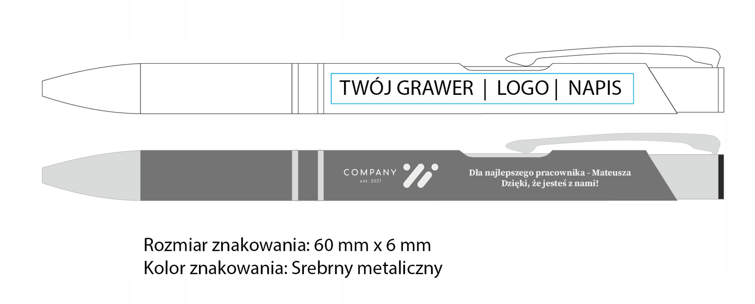 Uwaga: Dodatkowo oferujemy usługę grawerowania z drugiej strony przedmiotu w cenie 14,90 zł brutto. Wtedy mają Państwo własny grawer po obu stronach długopisu.