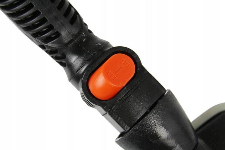 Krótka szczotka do mycia. Korpus szczotki wykonany jest z mocnego tworzywa posiadającego włącznik przepływu wody.