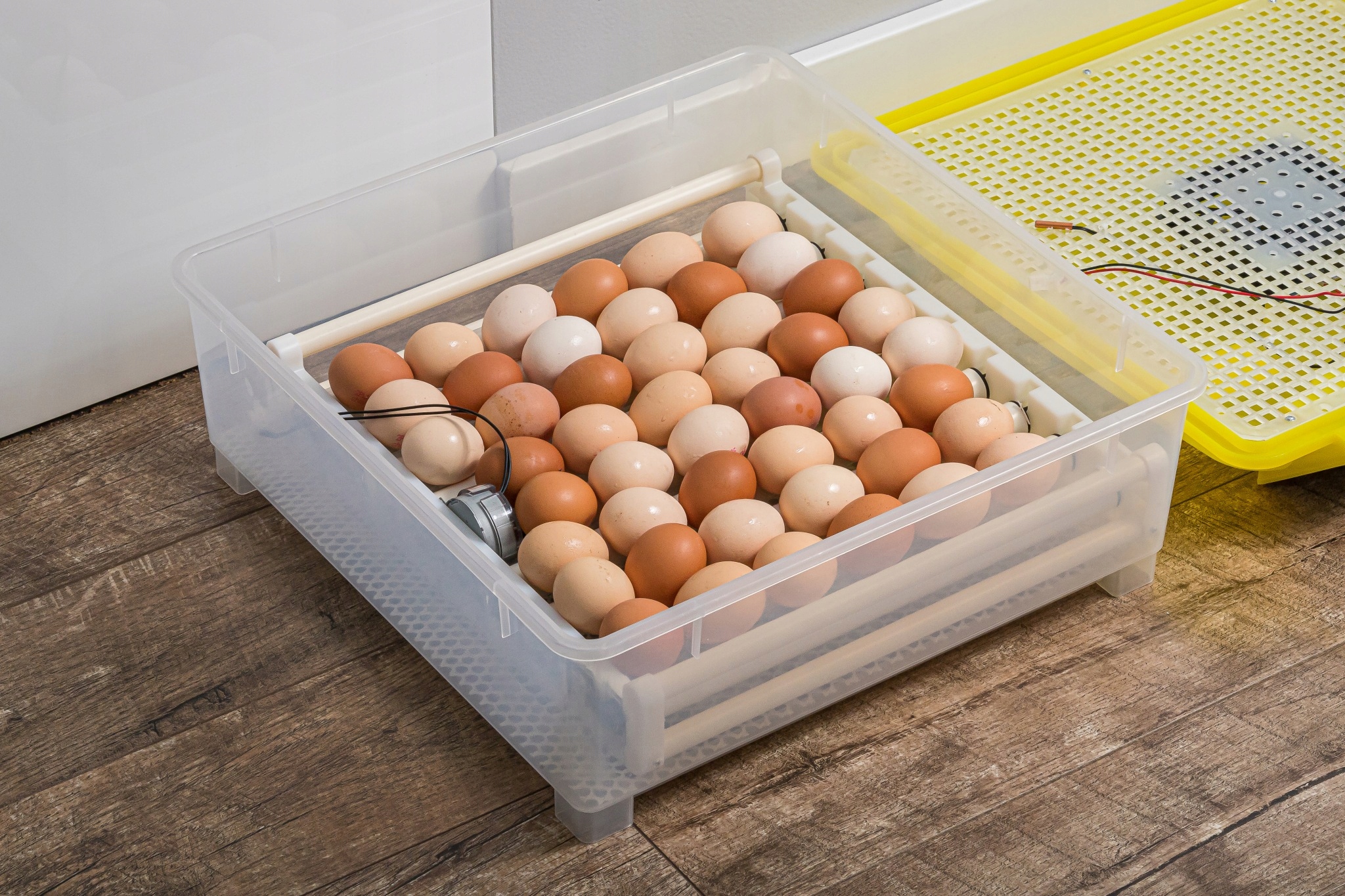 В инкубатор можно поместить до 54 куриные яйца размера S.