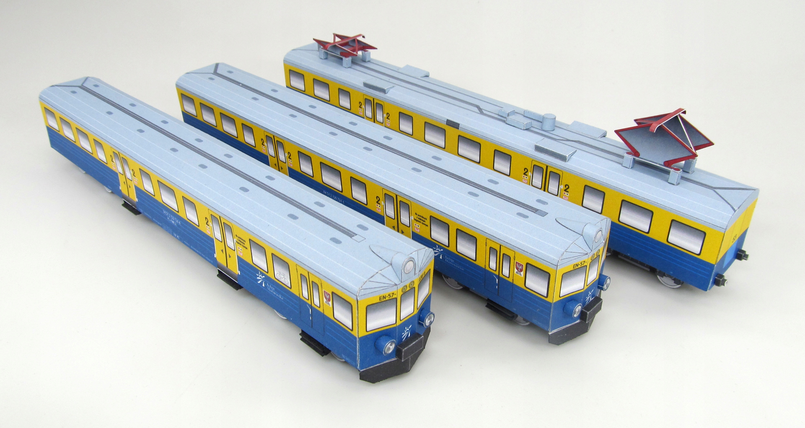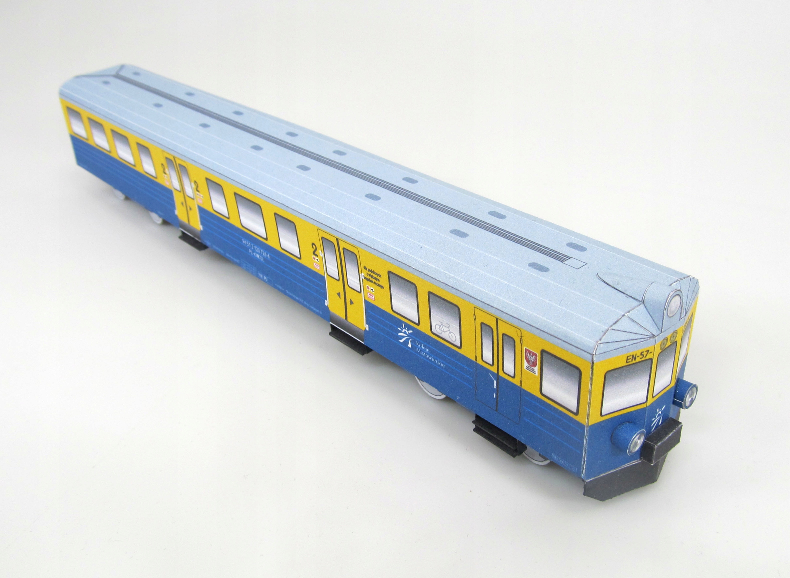 Образец содержит картонную модель для склеивания, представляющую состав электрического узла Тягового EN-57 (038) в покраске подвижного состава, используемого Мазовецкими железными дорогами.
