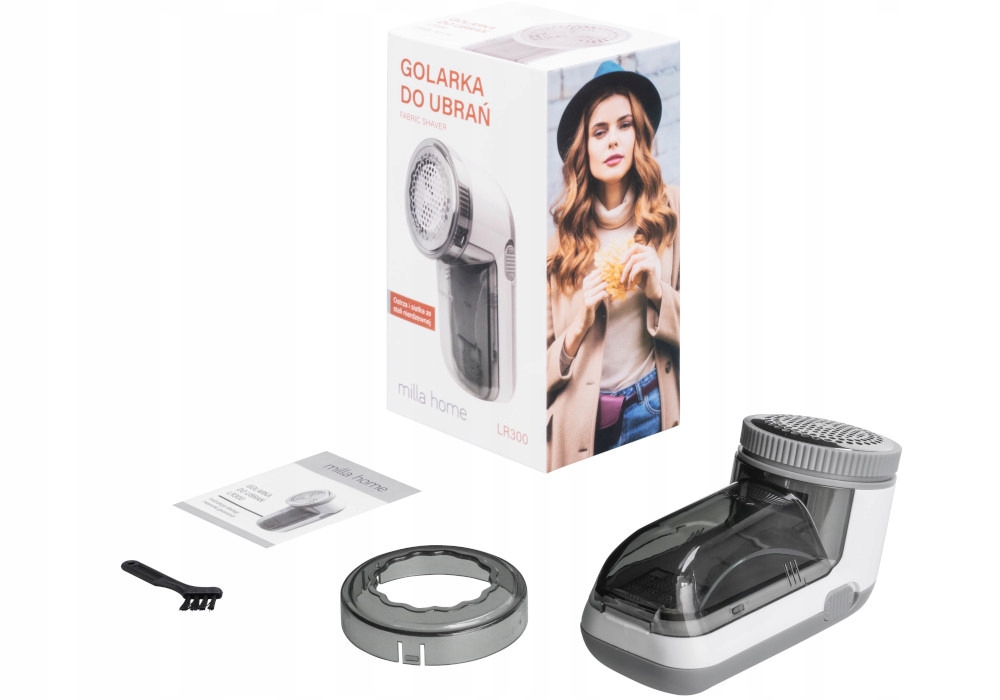 W zestawie oprócz golarki do ubrań MILLA HOME LR300 znajdziesz pierścień ochraniający, szczoteczkę oraz instrukcję obsługi w języku polskim z warunkami gwarancji.