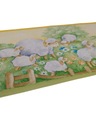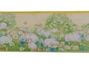 Wzór: Owce i owieczki na kwietnej zielonej łące. Drzewa i zabudowania. Tło blado żółte. Dolna krawędź jasno zielona, górna ostro żółta.