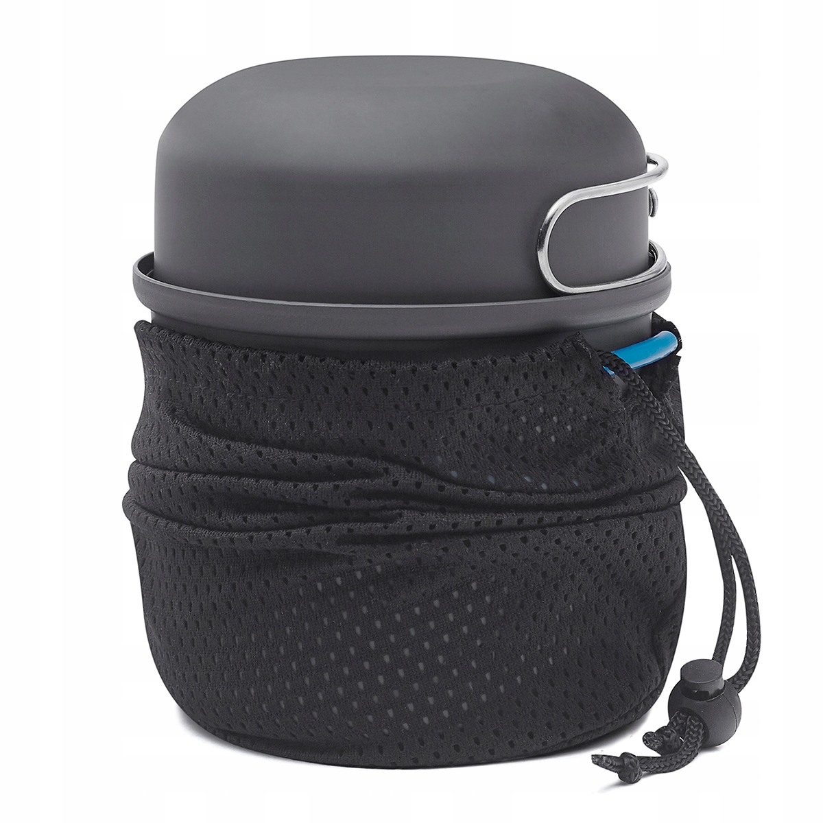 Wygodne składane uchwyty znajdują się przy garnku i pokrywce. Garnek dodatkowo pozostaje chłodny dzięki izolacji na uchwycie. Projekt jest na tyle przemyślany, że wewnątrz garnka mieszczą się kartusze z gazem o pojemności od 100 g do 300 g (z małym palnikiem), co ułatwia transport i oszczędza miejsce w plecaku.