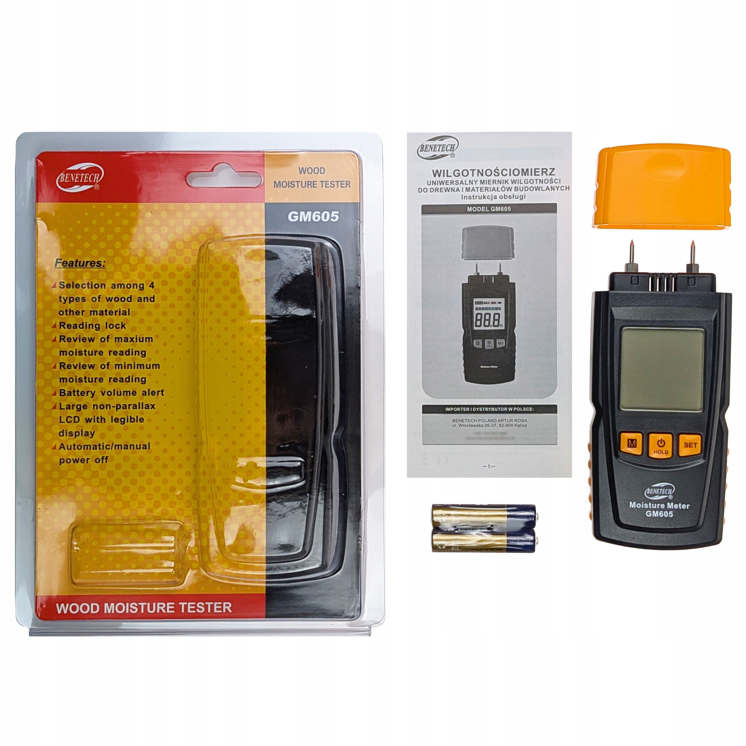 Miernik wilgotności do drewna, a także innych materiałów wykorzystujący sondy mierzące oporność do pomiaru zawartości wody. Urządzenie posiada 4 grupy do mierzenia wilgotności różnych gatunków drewna oraz 4 grupy do pomiaru wilgotności materiałów budowlanych.