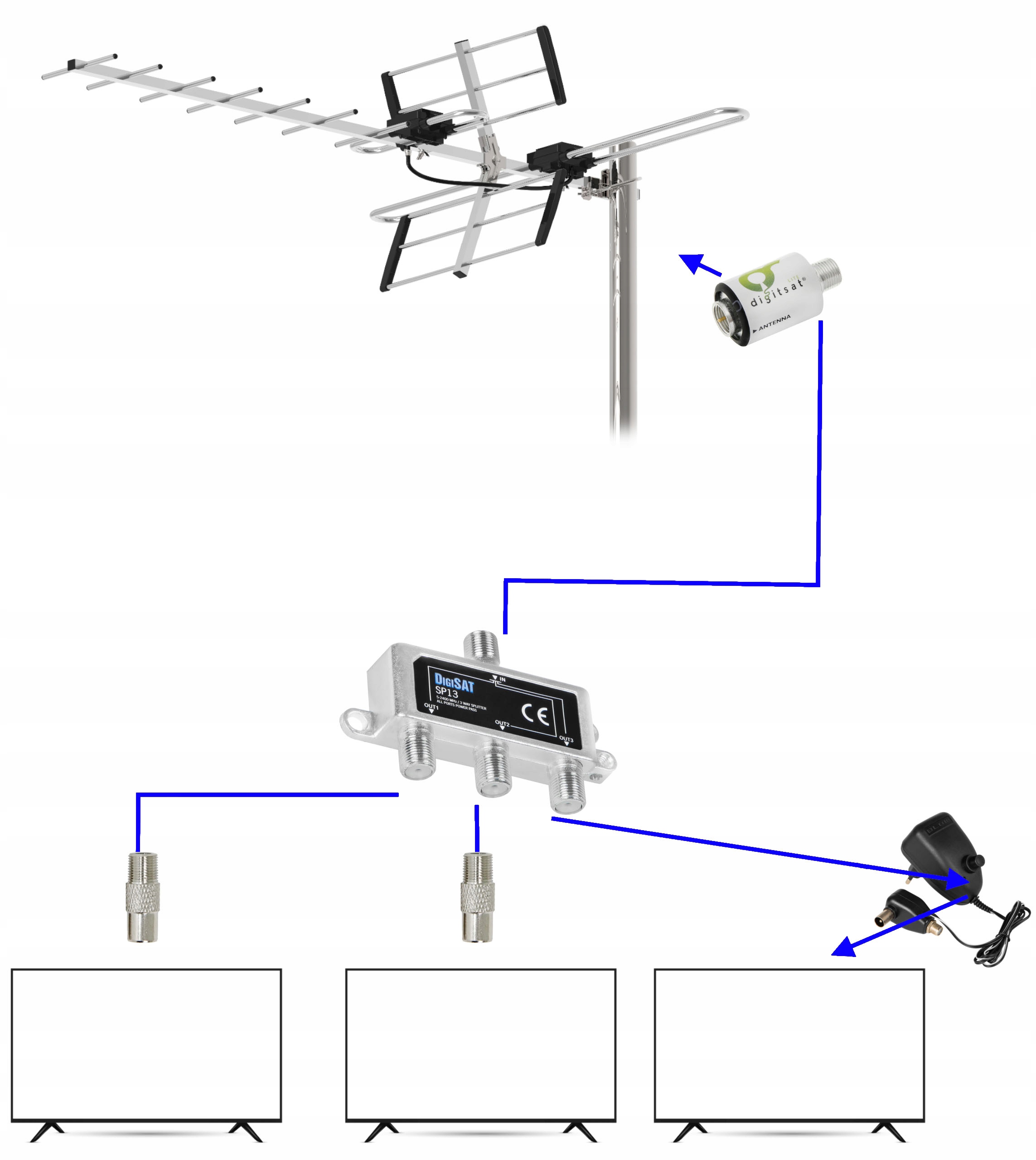 Используемый разделитель питания с розеткой F значительно облегчает подключение антенного провода к источнику питания.