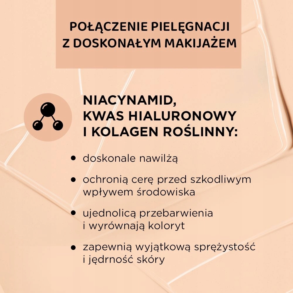 Nowa, ulepszona formuła podkładu z pielęgnującym niacynamidem zadba o głębokie nawilżenie i odżywienie skóry. Kosmetyk zapewni naturalny wygląd i zatuszuje niedoskonałości cery.