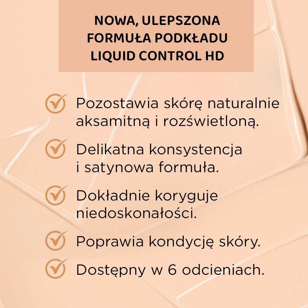 Podkład LIQUID CONTROL to wyjątkowe połączenie głębokie pielęgnacji z doskonałym makijażem. Kosmetyk, dzięki delikatnej konsystencji i lekkiej formule, pozostawi skórę naturalnie aksamitną i rozświetloną. Receptura nie zatka porów i pozwoli cerze oddychać. Jego trwałość zapewnia aż 24 godziny doskonałego makijażu i efektu baby face! Niacynamid, kwas hialuronowy i kolagen roślinny doskonale nawilżą i zadbają o odpowiednie nawodnienie skóry. Ochronią ją przed szkodliwym wpływem środowiska. Ujednolicą przebarwienia i wyrównają koloryt. Receptura zapewni wyjątkową sprężystość i jędrność cery oraz poprawi jej kondycję. Podkład dostępny w trzech odcieniach.