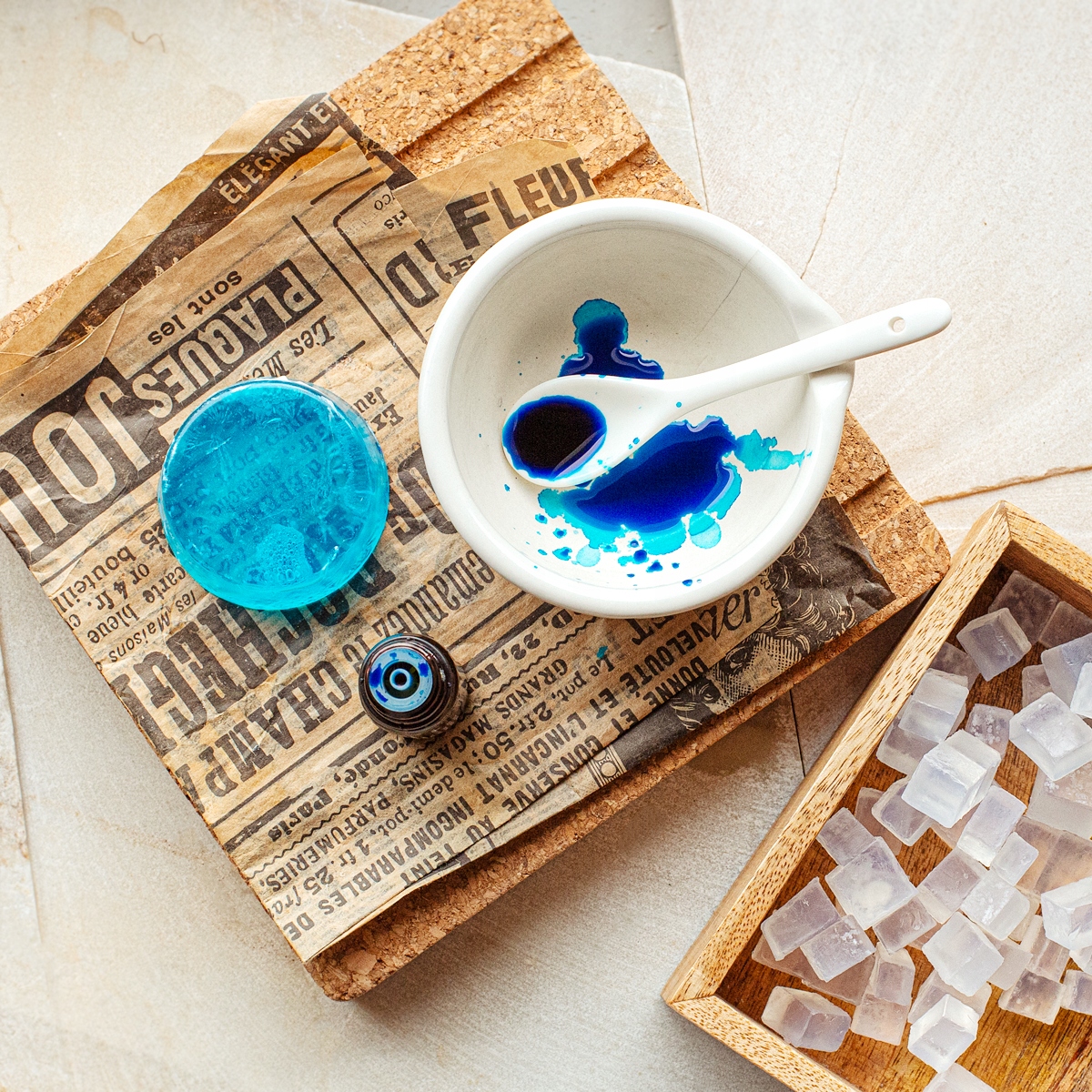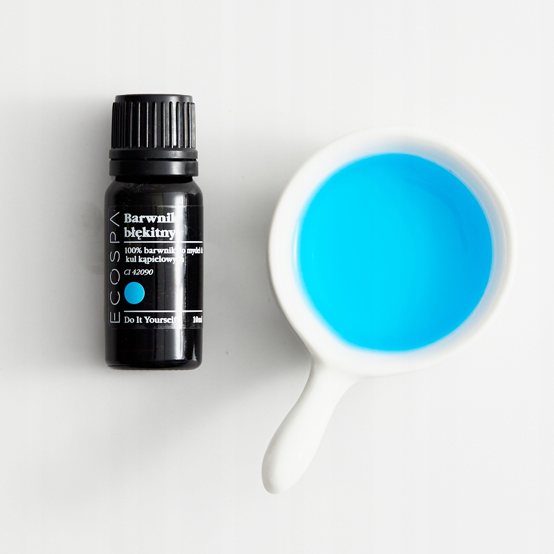 Barwnik błękitny z oferty ECOSPA jest dostępny w szklanej butelce z kroplomierzem, dzięki któremu można łatwo odmierzyć odpowiednią ilość barwnika.