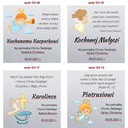 2️⃣ następnie dodaj do koszyka, a w uwagach do zakupu (poniżej wyboru metody dostawy) podaj nr wzoru który wybrałeś, oraz te dane które należy zmienić. Zaznaczyliśmy je na czerwono (imiona, datę).