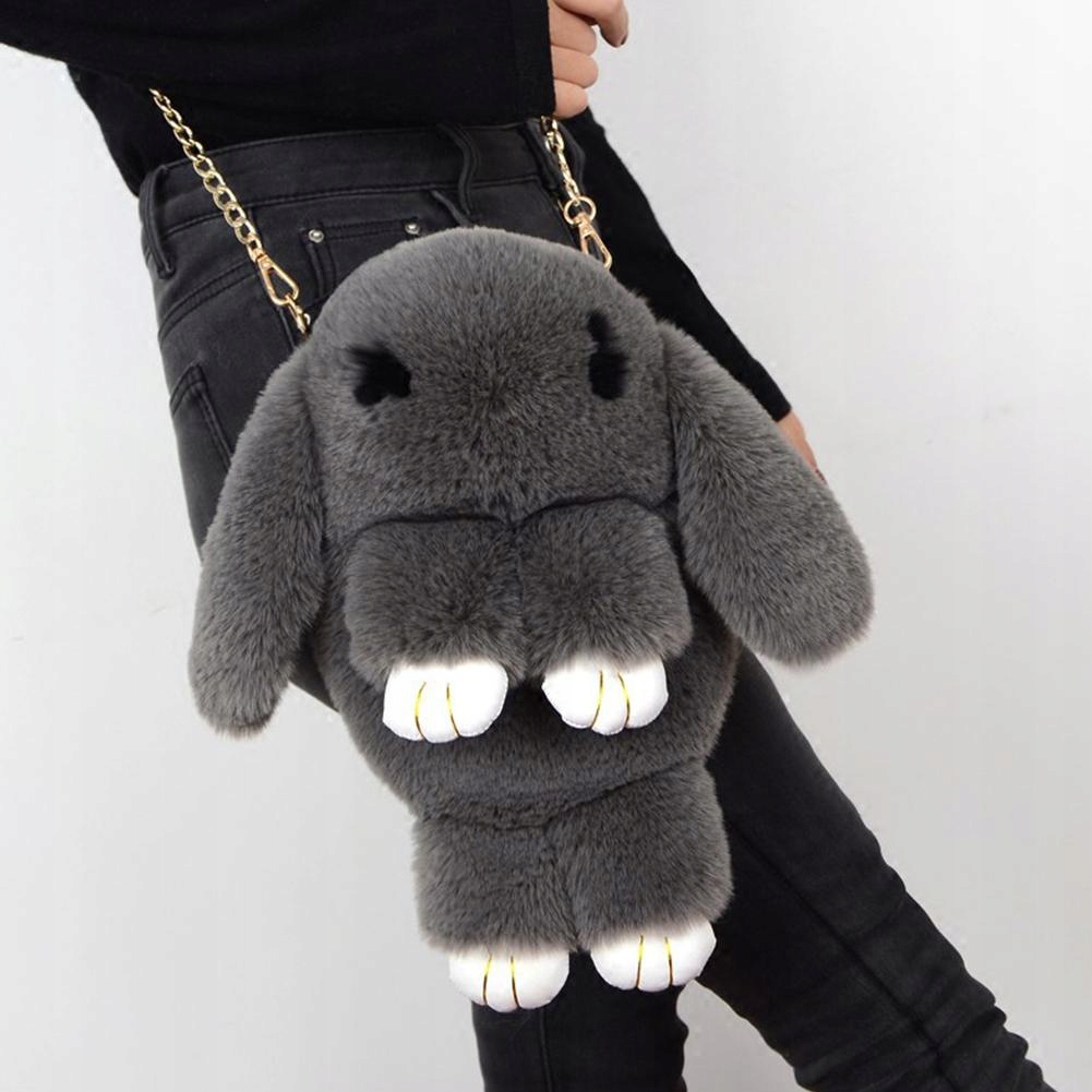 Torebeczka w kształcie ślicznego króliczka. Wykonana z mięciutkiego pluszu. Idealna do przechowywania różnych drobiazgów np. telefonu, kosmetyków, chusteczek itp. Posiada złoty łańcuszek, który można dowolnie przepinać wówczas torebka zamienia się w plecak.