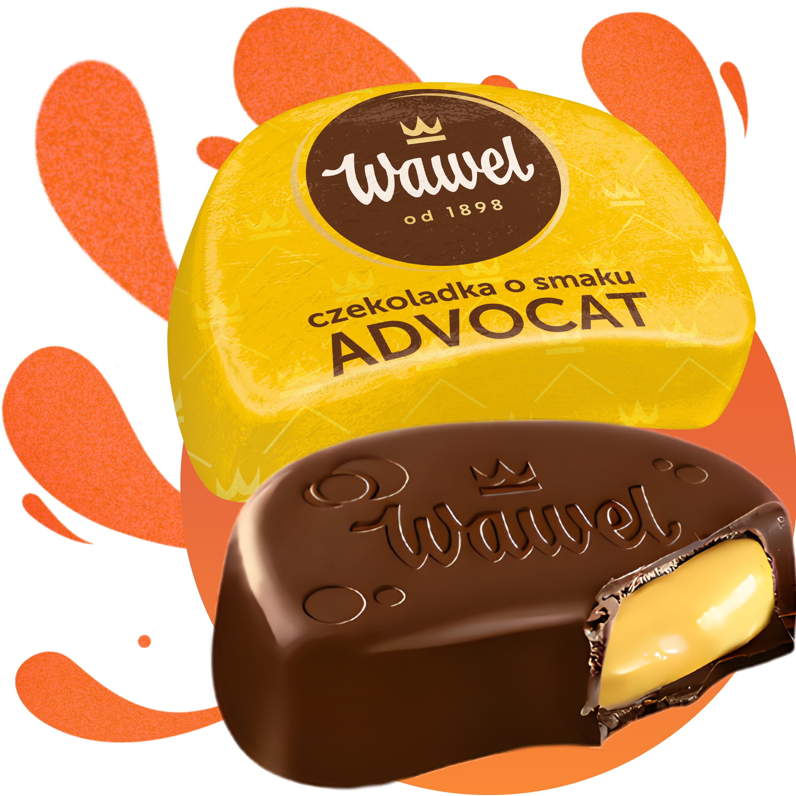 Czekoladki nadziewane Wawel Adwokat to połączenie wykwintnej, deserowej czekolady oraz charakterystycznego nadzienia o smaku znanego holenderskiego likieru. Gęsty, wyrazisty krem o delikatnie alkoholowym smaku otulony został ciemną wytrawną czekoladą o wyrazistym smaku.