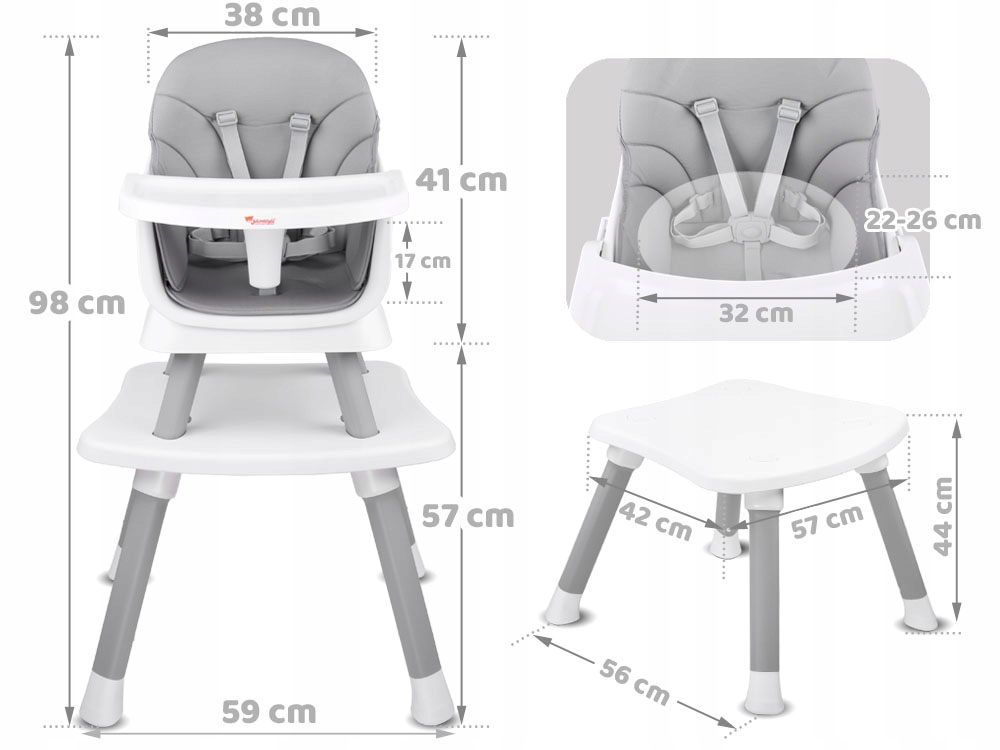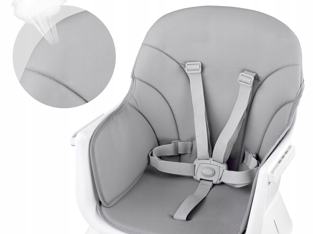 Krzesełko do karmienia to zestaw 6w1 idealny dla dzieci już od 6 m-ca, które zaczęły samodzielnie siedzieć. Modułowy mebel w nowoczesnym stylu, będzie pasował do każdego pokoju dziecięcego, salonu, kuchni. Dzięki jego możliwości użytkowania w różnych opcjach będzie pasował do stołu w jadalni, a także do kącika zabaw dziecięcych. Wygodny fotelik, prawidłowo wyprofilowany posiada pięciopunktowe pasy bezpieczeństwa, blokadę przed zsunięciem się z krzesełka. Tapicerka wykorzystana do obicia fotelika jest oddychająca, wykonana z łatwo czyszczącego materiału co ma istotne znaczenie w utrzymaniu czystości mebla. Mebel posiada zdejmowaną, łatwą do utrzymania w czystości tackę. Nóżki krzesełka posiadają antypoślizgowe nakładki. Wielofunkcyjny mebel będzie rósł wraz dzieckiem i bez problemu dostosuje się do wymaganych potrzeb w danej sytuacji.