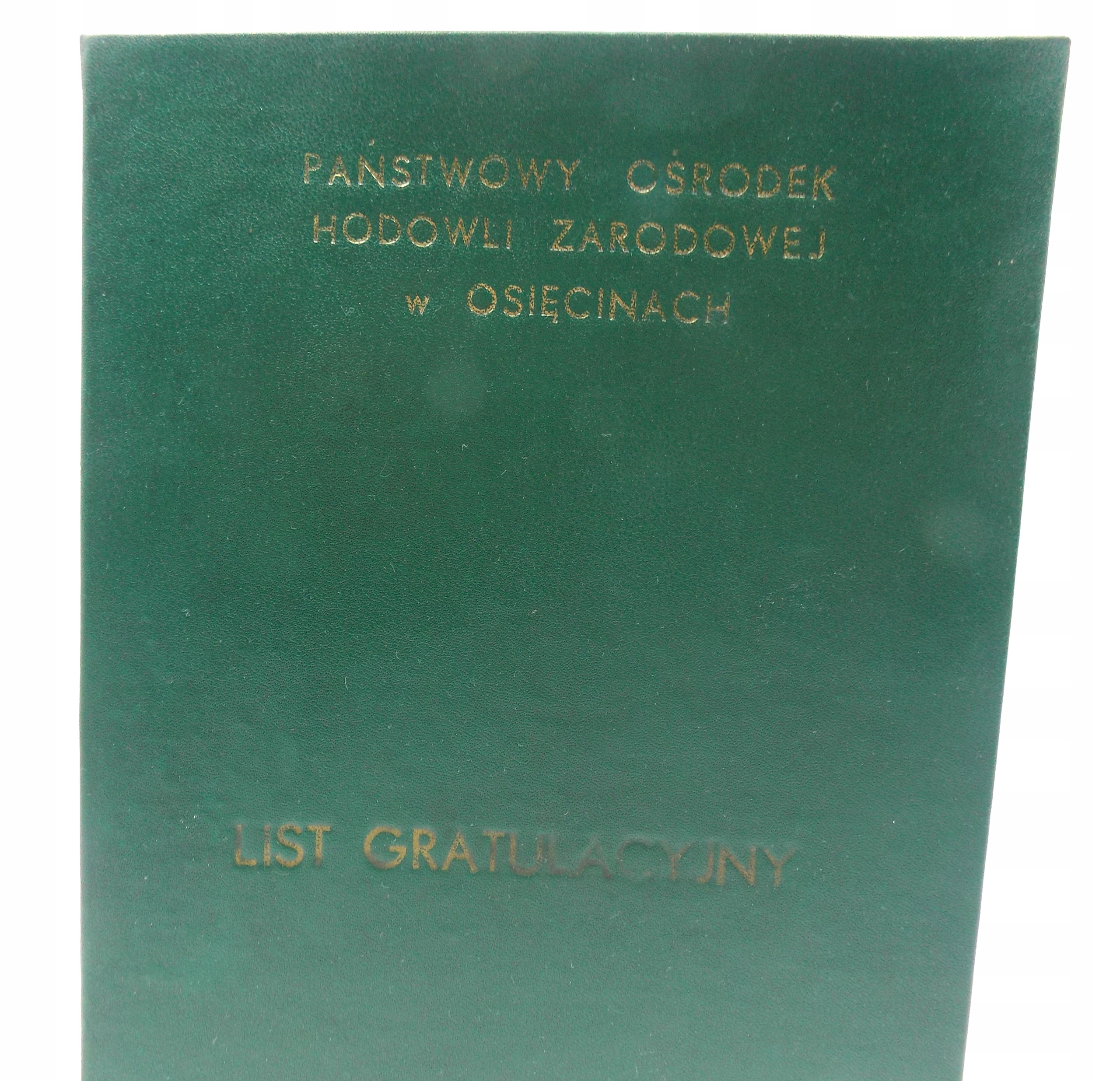 List Gratulacyjny Państwowy Ośrodek Hodowli Zarodowej w Osięcinach z okresu PRL. 30 lat pracy zawodowej. Wymiary; wys. 30 x 21 cm.
