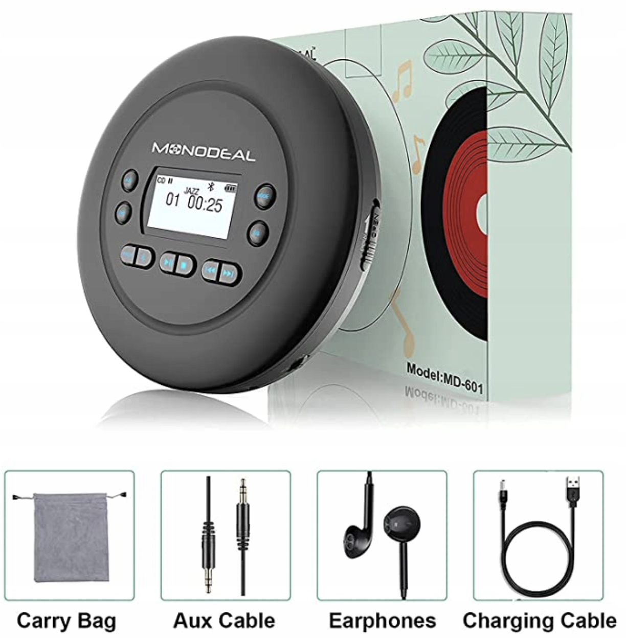 MONODEAL przenośny odtwarzacz CD, Bluetooth, do ponownego ładowania, Discman, odtwarzacz CD, do samochodów i dzieci, z zabezpieczeniem przed wyskywaniem się, mały ze słuchawkami.