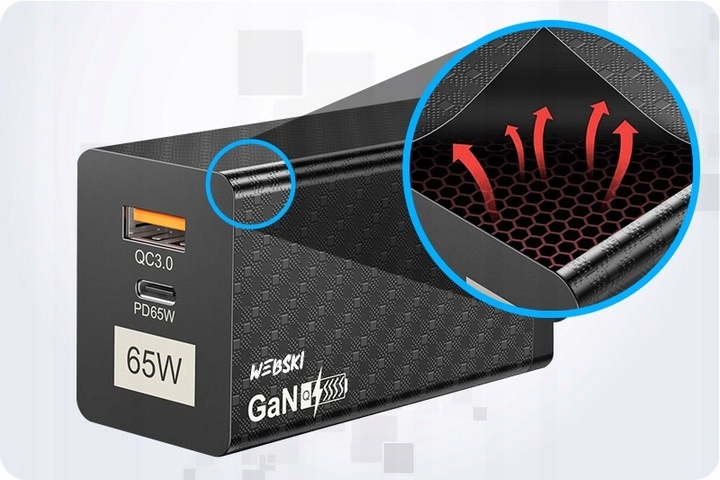 Webski ProGaN to ładowarka dla wszystkich, którzy cenią sobie wygodę i szybkość ładowania swoich urządzeń. Posiada uniwersalne złącze USB-C o mocy 65W, co pozwala na szybkie ładowanie laptopów i tabletów oraz złącze USB-A umożliwia ładowanie telefonów komórkowych, słuchawek bezprzewodowych i innych urządzeń.
