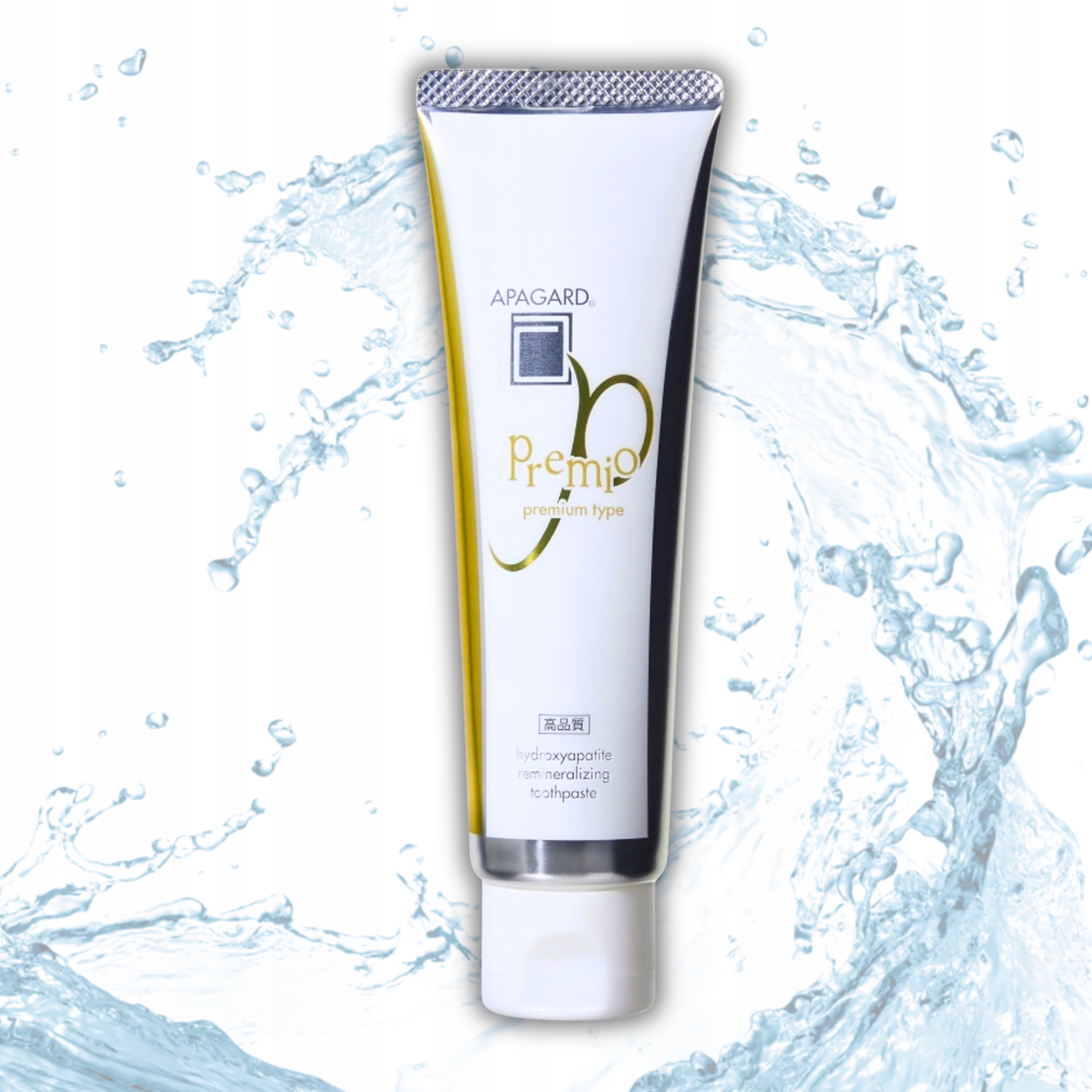 Pasta do zębów APAGARD Premio o zwiększonej zawartości hydroksyapatytu dla efektywnego naturalnego rozjaśniania i ochrony szkliwa zębów przed próchnicą.