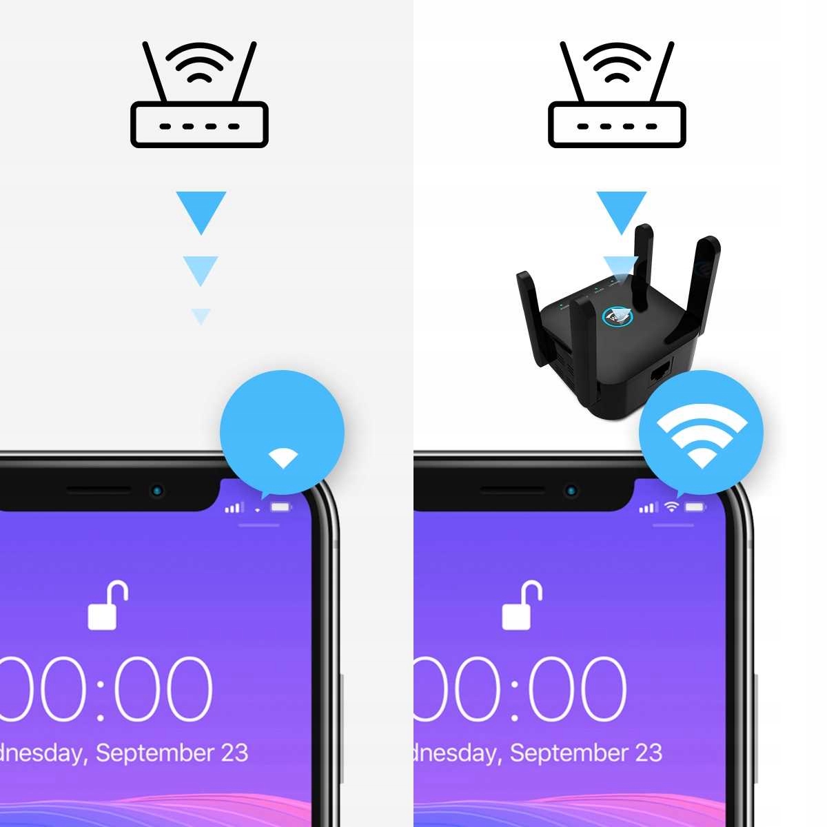 ⭐ Wzmacniacz zasięgu posiada dwuzakresowy router Wi-Fi - 2.4 i 5 GHz, który pozwala na zwiększenie prędkości transmisji danych na długich i krótkich odległościach.