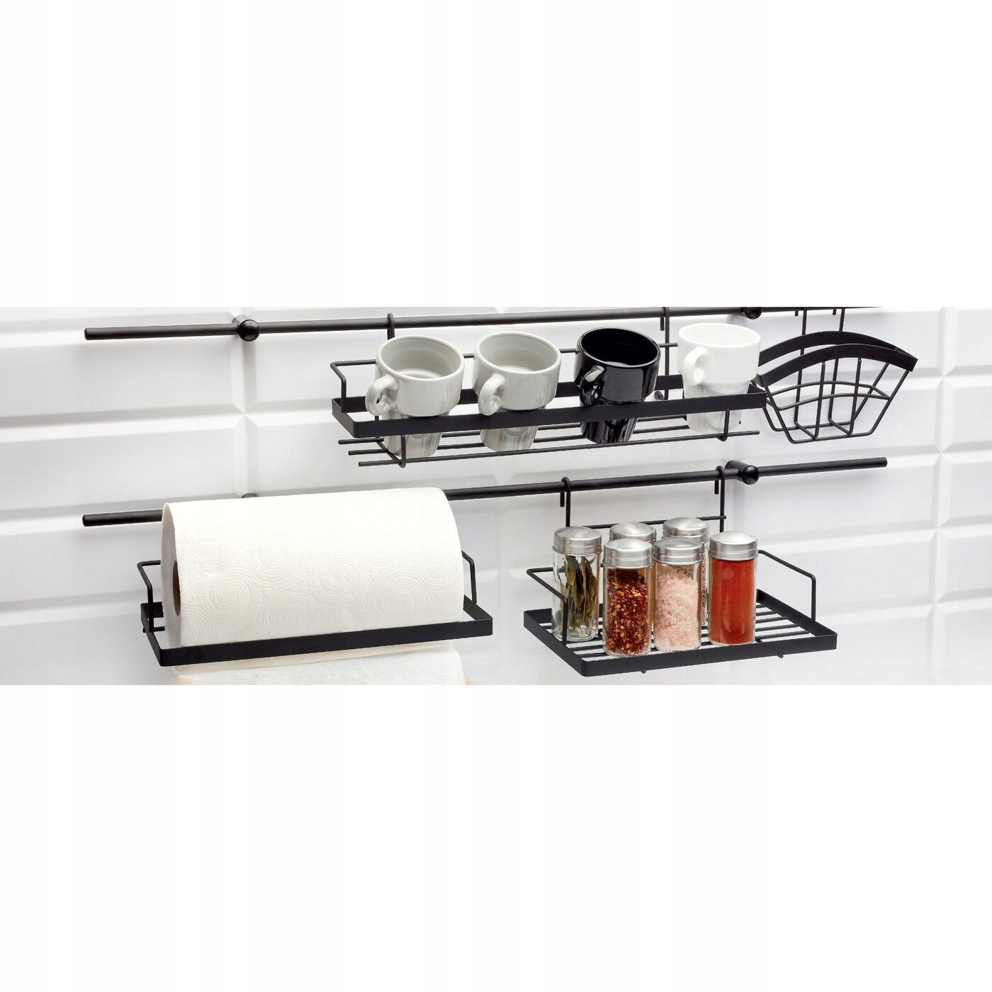 Zestaw pomoże ci zadbać o porządek w kuchni i ułatwi codzienne gotowanie oraz sprzątanie. Malowany na czarno metal podkreśli elegancję i nowoczesny charakter pomieszczenia. Takie relingi z akcesoriami to solidne rozwiązanie na lata