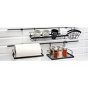 Dwa metalowe relingi kuchenne Tadar 76 cm pomieszczą jednak znacznie więcej. W sumie cały zestaw zawiera aż 16 elementów, w tym 2 koszyki uniwersalne, uchwyt na ręczniki papierowe, koszyk na serwetki oraz kołki potrzebne do montażu całości.