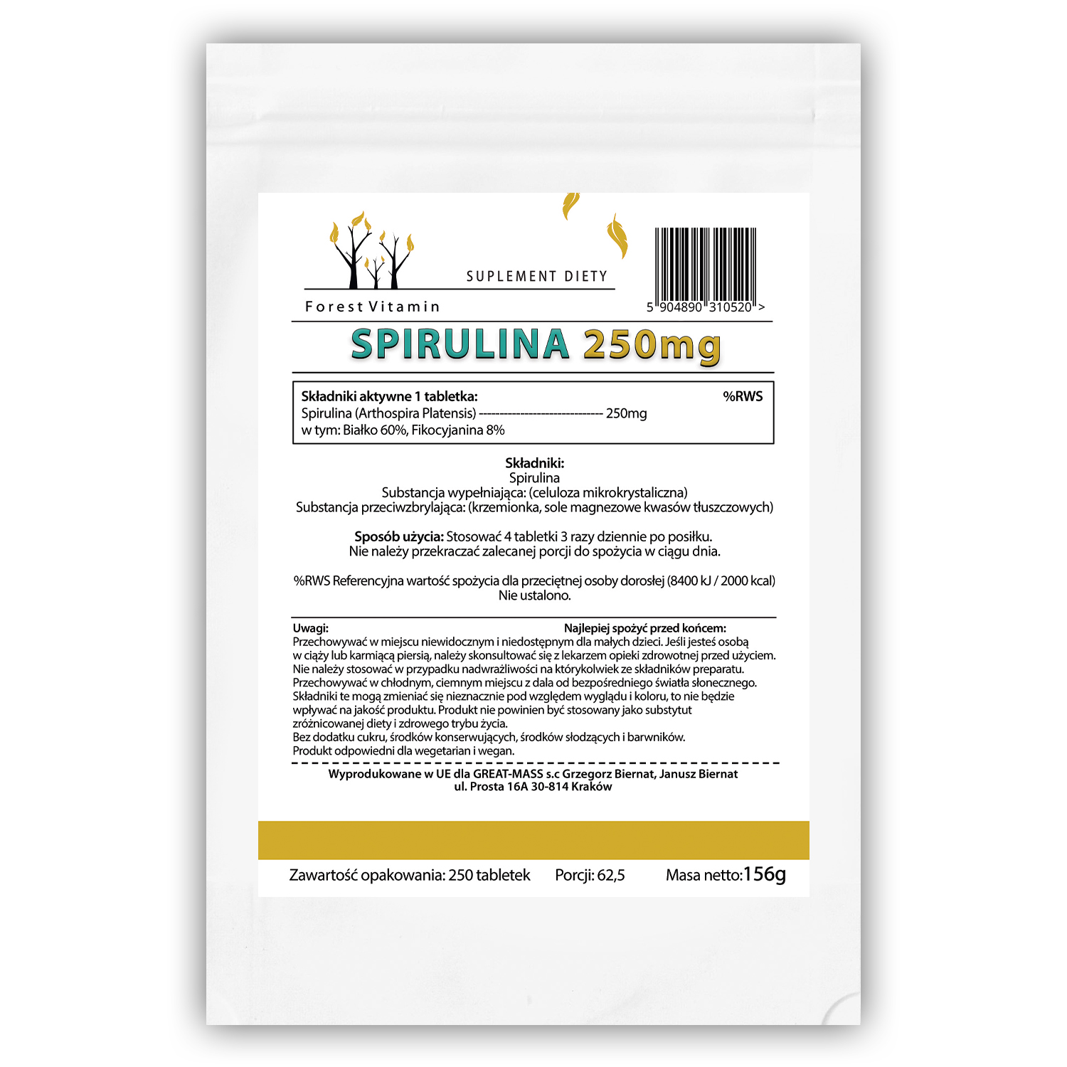 Każda tabletka zawiera 250mg Spiruliny, co pozwala na łatwe i precyzyjne dostosowanie dawki do własnych potrzeb.