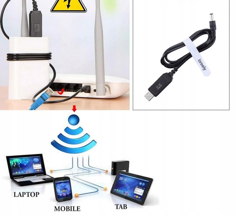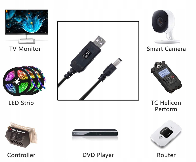 Kabel zasilający, przejściówka wtyk USB-A na wtyk DC 5,5x2,1mm. Umożliwia ładowanie urządzeń wyposażonych w gniazdo zasilające DC 5,5x2,1mm z portu USB komputera, lub uniwersalnych zasilaczy i ładowarek wyposażonych w gniazdo USB typu A. Można nim zasilać z USB 5V moduły ARDUINO lub odwrotnie, np. z zasilacza DC 5,5x2,1mm podłączyć zasilanie przez USB-A.