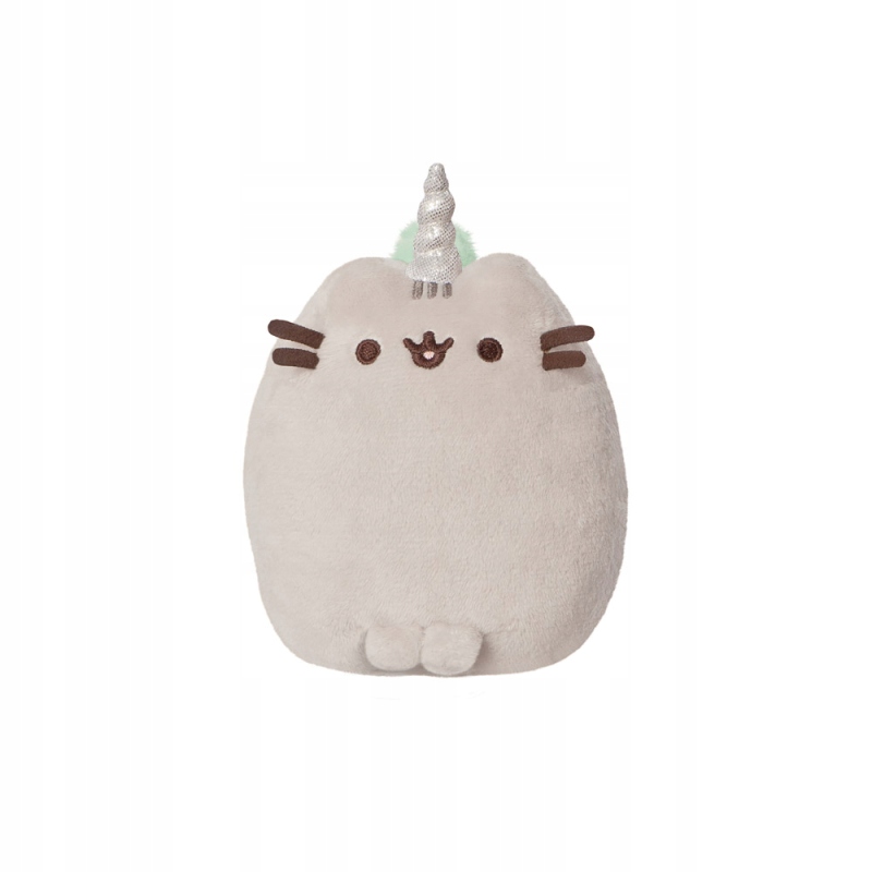 Pusheen jednorożec siedzący, pionowy ze srebrzystym, połyskliwym rogiem i grzywą tęczową i tęczowym ogonkiem. Od spodu wyszyte łapki różowa nicią.